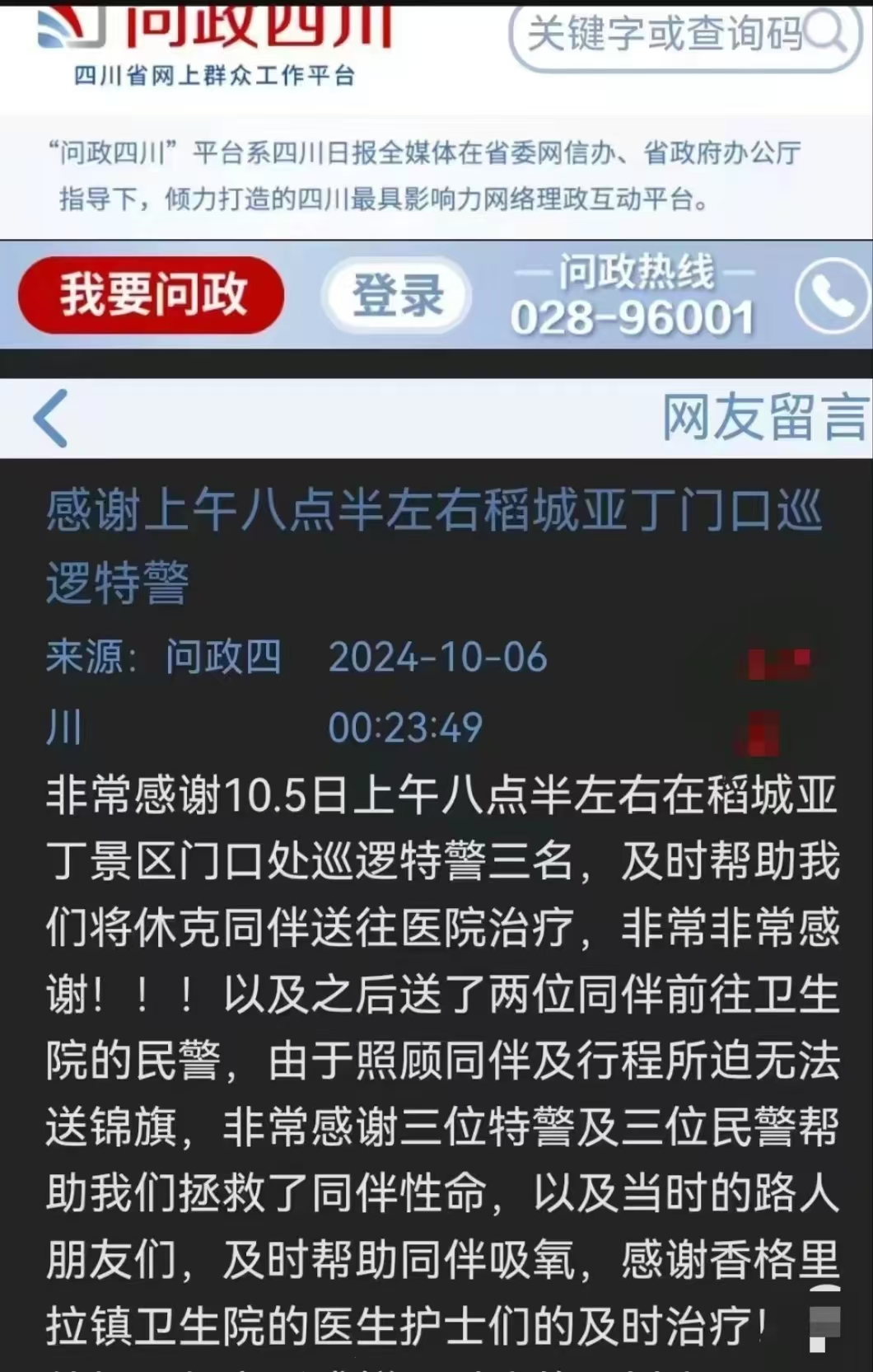 “非常感謝10月5日上午8點(diǎn)半,在亞丁景區(qū)門口的三位特巡警,將我們休克的同伴及時(shí)送往醫(yī)院治療。由于照顧同伴及行程所迫無法送錦旗,但這份恩情我們永遠(yuǎn)銘記在心!”10月6日,一封來自游客的感謝信投遞在“問政四川”平臺(tái)上,信中充滿了他對(duì)眾多好心人的感激之情。據(jù)稻城縣公安局特巡警大隊(duì)副大隊(duì)長(zhǎng)四郎澤仁介紹,10月5日,亞丁景區(qū)迎來眾多游客。我和隊(duì)員們正在景區(qū)門口的執(zhí)勤點(diǎn)位上執(zhí)勤,確保游客的安全和秩序。突然,聽到一陣急促的呼救聲,我們立刻循聲跑去,只見一名女游客倒在地上,身體不停地發(fā)抖,已經(jīng)陷入休克狀態(tài)?!懊鎸?duì)這突如其來的緊急情況,我們按照日常養(yǎng)成的急救常識(shí),立即對(duì)游客進(jìn)行了初步判斷,根據(jù)其癥狀和表現(xiàn),我們判斷是由于缺氧所導(dǎo)致的,并立即對(duì)她進(jìn)行了初步的搶救?!痹诔醪綋尵群螅撚慰偷那闆r雖有所緩解。于是,我和我的戰(zhàn)友們立即開辟起一條“綠色通道”,用警車將患者轉(zhuǎn)送至鎮(zhèn)衛(wèi)生院。為了不浪費(fèi)任何一分鐘的治療時(shí)間,到達(dá)衛(wèi)生院后特巡警隊(duì)員將患者背上,送入診療室。當(dāng)看到游客在醫(yī)生的救治下逐漸恢復(fù)意識(shí),我們懸著的心也終于放了下來。那一刻,我們深深地感受到了作為一名警察的責(zé)任和使命。