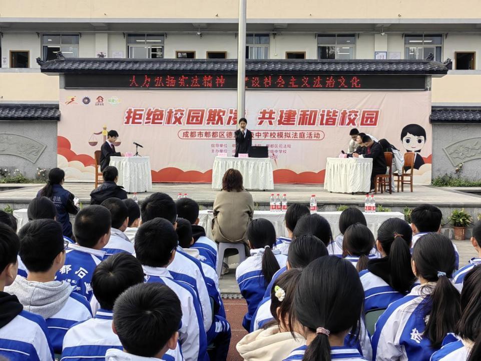 在德源中學,一場別開生面的“模擬法庭”活動正在莊嚴地進行,庭審中,15名青少年化身審判員、書記員、公訴人、辯護人、法警等角色,共同參與審理一起校園欺凌案件,活動通過還原庭審過程,讓師生們“沉浸式”感受法律威嚴。活動中,德源司法所的工作人員還為同學們送上憨態(tài)可掬的“法治熊貓”。