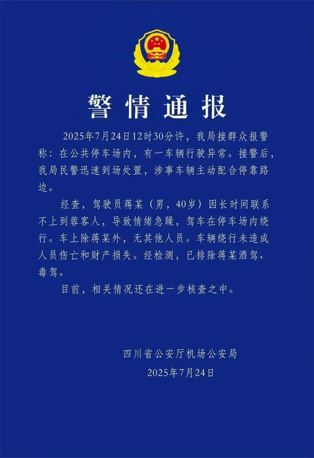 經(jīng)查,駕駛員蔣某(男,40歲)因長時間聯(lián)系不上到蓉客人,導(dǎo)致情緒急躁,駕車在停車場內(nèi)繞行。車上除蔣某外,無其他人員。車輛繞行未造成人員傷亡和財(cái)產(chǎn)損失。經(jīng)檢測,已排除蔣某酒駕、毒駕。