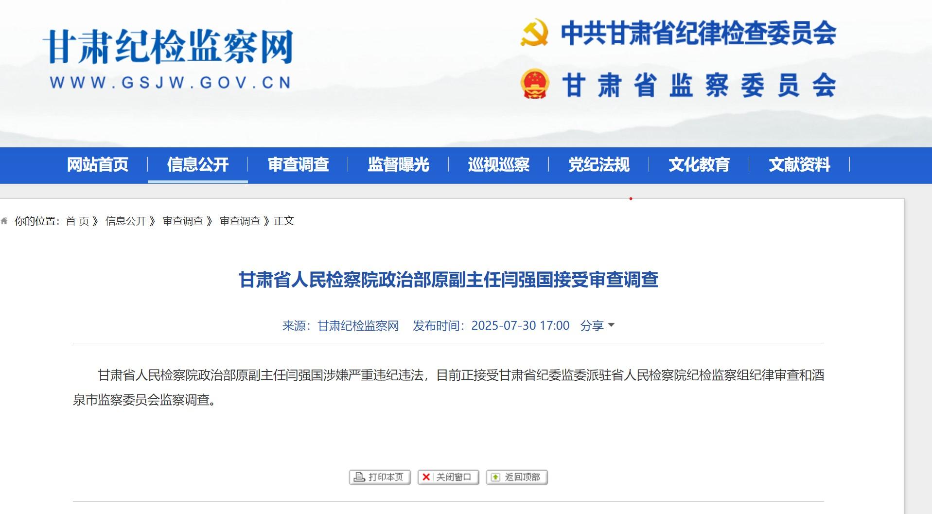 據(jù)甘肅紀(jì)檢監(jiān)察網(wǎng)7月30日消息,甘肅省人民檢察院政治部原副主任閆強(qiáng)國(guó)涉嫌嚴(yán)重違紀(jì)違法,目前正接受甘肅省紀(jì)委監(jiān)委派駐省人民檢察院紀(jì)檢監(jiān)察組紀(jì)律審查和酒泉市監(jiān)察委員會(huì)監(jiān)察調(diào)查。