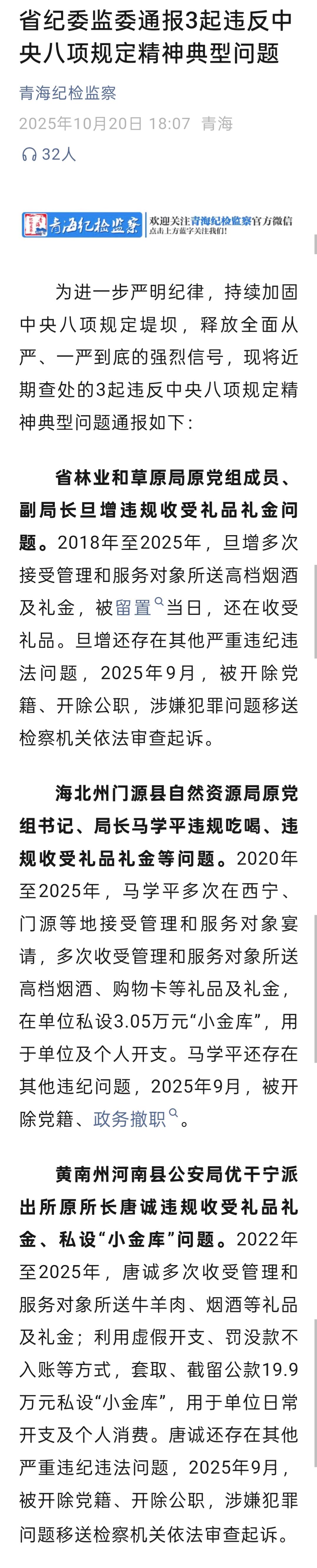 為進一步嚴明紀律,持續(xù)加固中央八項規(guī)定堤壩,釋放全面從嚴、一嚴到底的強烈信號,10月20日,青海省紀委監(jiān)委通報近期查處的3起違反中央八項規(guī)定精神典型問題。