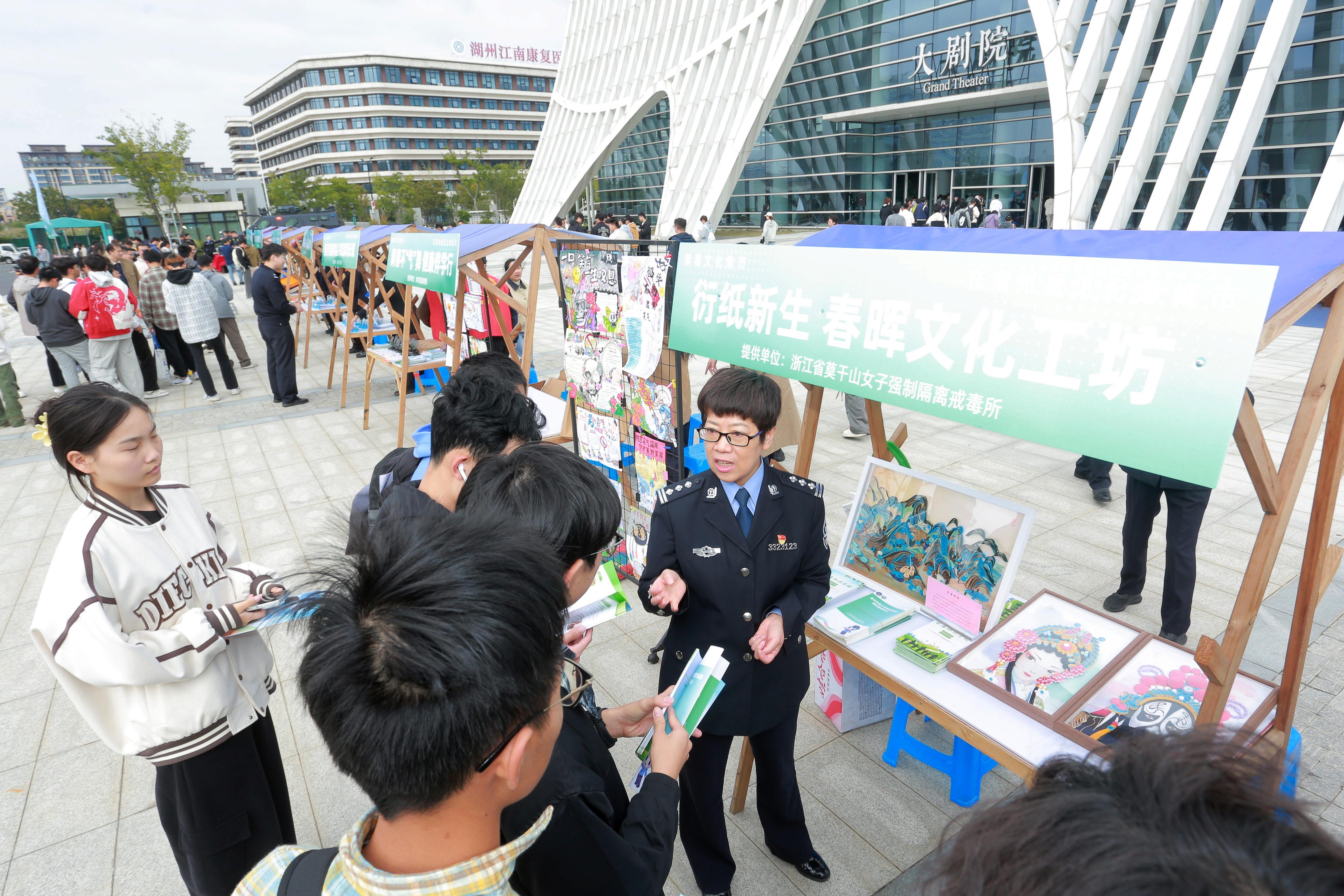 當(dāng)天,浙江水利水電學(xué)院大劇院前廣場的禁毒市集率先“開市”,巨型魔方禁毒logo醒目亮眼,創(chuàng)客大賽獲獎作品集中展出;市公安局特警支隊的緝毒犬現(xiàn)場表演“識毒絕技”,靈敏嗅覺引得師生陣陣驚嘆;“機器狗尋毒”演示展現(xiàn)科技禁毒新力量,南潯公安分局特警裝備與防暴車展示更讓師生直觀感受禁毒執(zhí)法硬實力。此外,湖州市南潯區(qū)公安分局、檢察院、法院、教育局、司法局等十余個禁毒職能部門設(shè)攤宣傳,通過“笑氣”模型展示、知識折頁發(fā)放、互動答疑等形式,將“笑氣”危害與防范知識傳遞給每一位參與者。