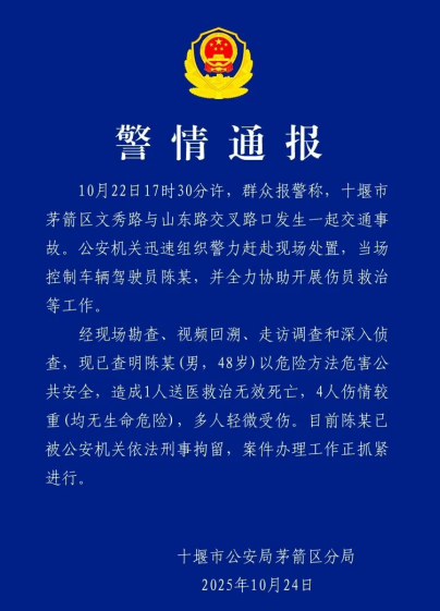 10月25日凌晨,湖北省十堰市公安局茅箭區(qū)分局發(fā)布警情通報(bào):10月22日17時(shí)30分許,群眾報(bào)警稱,十堰市茅箭區(qū)文秀路與山東路交叉路口發(fā)生一起交通事故。公安機(jī)關(guān)迅速組織警力趕赴現(xiàn)場(chǎng)處置,當(dāng)場(chǎng)控制車輛駕駛員陳某,并全力協(xié)助開(kāi)展傷員救治等工作。