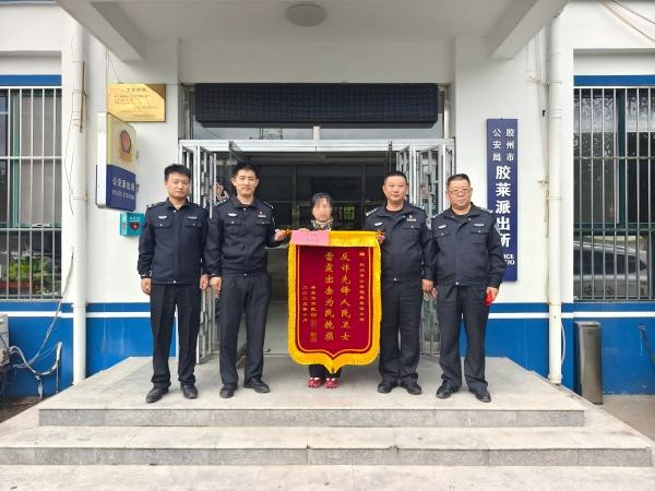 10月20日,翟女士來到膠萊派出所將被騙的16萬元領(lǐng)回,并特地將一面寫有“反詐先鋒人民衛(wèi)士 雷霆出擊為民挽損”字樣的錦旗送到民警的手中,以此向幫助自己挽回?fù)p失的民警表達(dá)謝意。