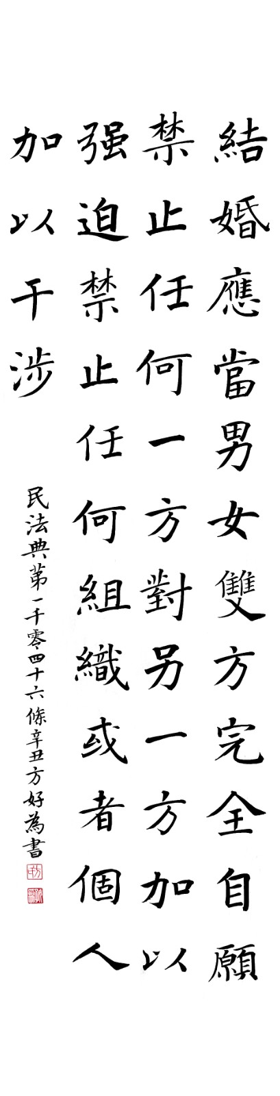 民法典第一千零四十六條 結(jié)婚應(yīng)當男女雙方完全自愿,禁止任何一方對另一方加以強迫,禁止任何組織或者個人加以干涉。