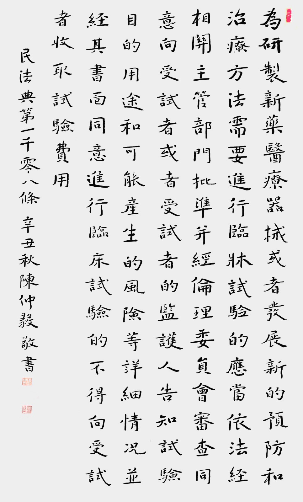 民法典第一千零八條 為研制新藥、醫(yī)療器械或者發(fā)展新的預(yù)防和治療方法,需要進(jìn)行臨床試驗的,應(yīng)當(dāng)依法經(jīng)相關(guān)主管部門批準(zhǔn)并經(jīng)倫理委員會審查同意,向受試者或者受試者的監(jiān)護(hù)人告知試驗?zāi)康?、用途和可能產(chǎn)生的風(fēng)險等詳細(xì)情況,并經(jīng)其書面同意。