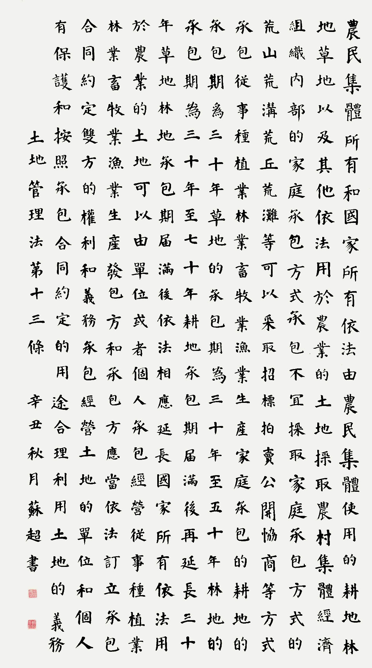 繼1600余位書法家參與書寫《中華人民共和國民法典》全部1260條法條之后,法治日報(bào)社聯(lián)合自然資源部法規(guī)司、自然資源部書畫研究會和北京昌平書法家協(xié)會,將筆端對準(zhǔn)土地管理“一法一條例”,即《中華人民共和國土地管理法》和《中華人民共和國土地管理法實(shí)施條例》。