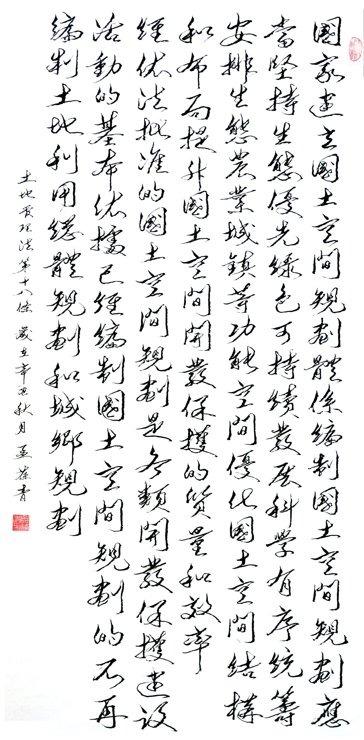 繼1600余位書法家參與書寫《中華人民共和國民法典》全部1260條法條之后,法治日報(bào)社聯(lián)合自然資源部法規(guī)司、自然資源部書畫研究會(huì)和北京昌平書法家協(xié)會(huì),將筆端對準(zhǔn)土地管理“一法一條例”,即《中華人民共和國土地管理法》和《中華人民共和國土地管理法實(shí)施條例》。