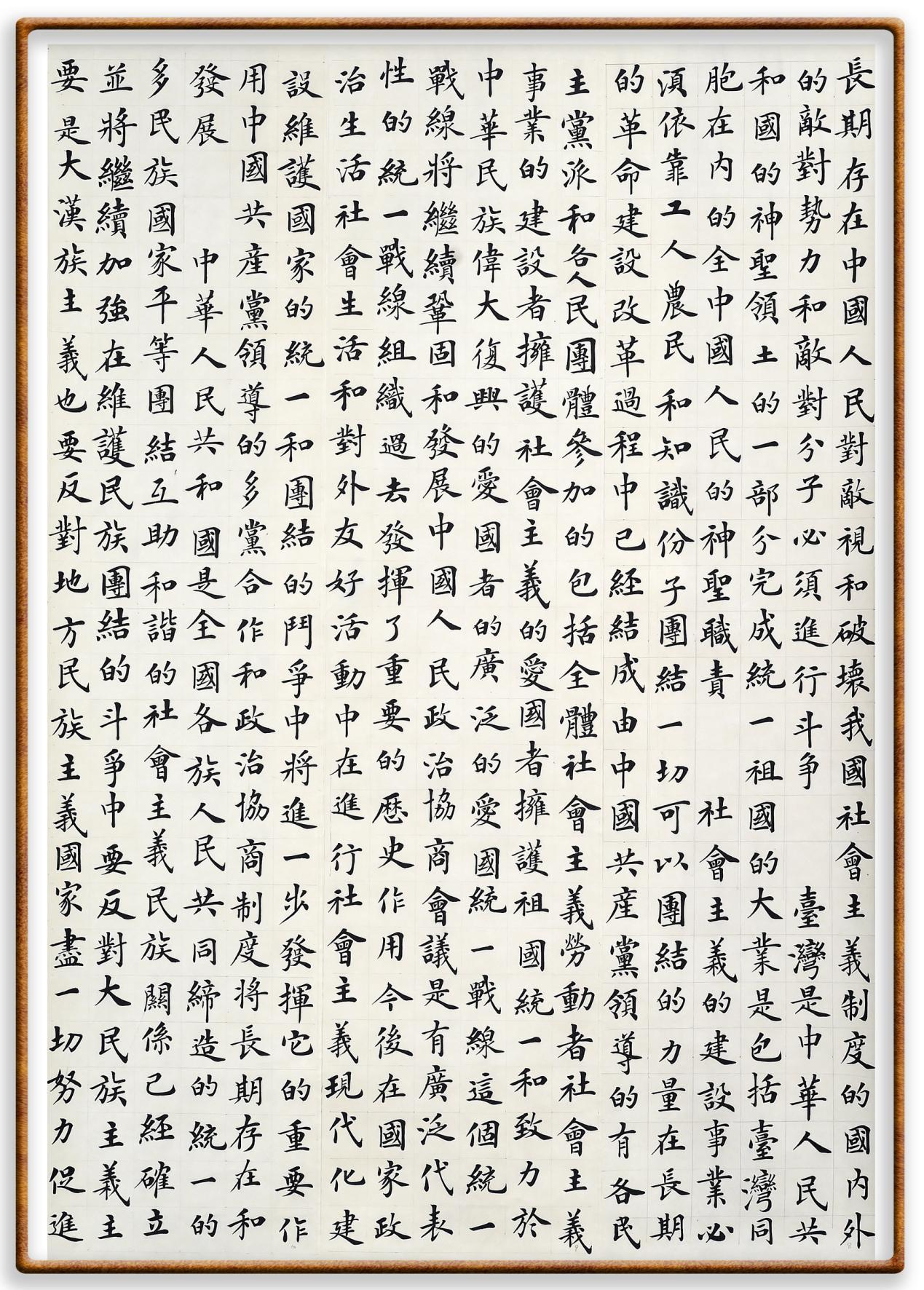 中華人民共和國是全國各族人民共同締造的統(tǒng)一的多民族國家。平等團結(jié)互助和諧的社會主義民族關(guān)系已經(jīng)確立,并將繼續(xù)加強。在維護民族團結(jié)的斗爭中,要反對大民族主義,主要是大漢族主義,也要反對地方民族主義。國家盡一切努力,促進全國各民族的共同繁榮。