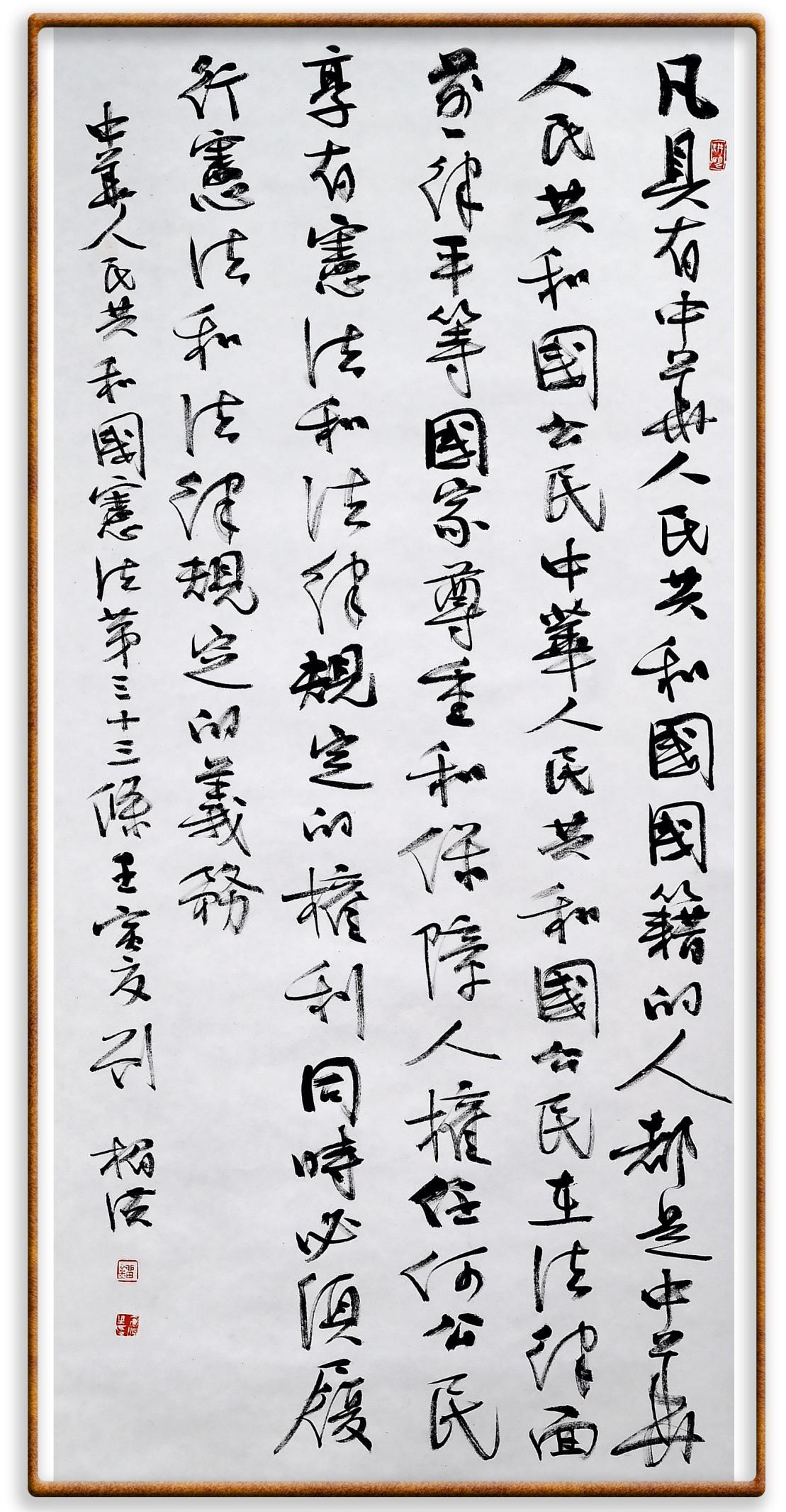 繼《中華人民共和國民法典》《中華人民共和國土地管理法》《中華人民共和國土地管理法實(shí)施條例》《中華人民共和國法律援助法》之后,法治日?qǐng)?bào)社聯(lián)合北京市司法局、北京市書法家協(xié)會(huì),將筆端對(duì)準(zhǔn)《中華人民共和國憲法》和《中華人民共和國行政處罰法》。