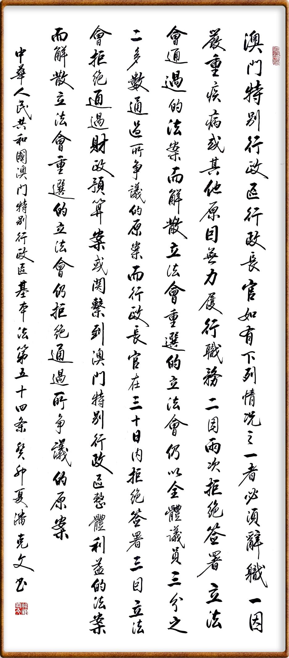 (二)因兩次拒絕簽署立法會通過的法案而解散立法會,重選的立法會仍以全體議員三分之二多數(shù)通過所爭議的原案,而行政長官在三十日內(nèi)拒絕簽署;