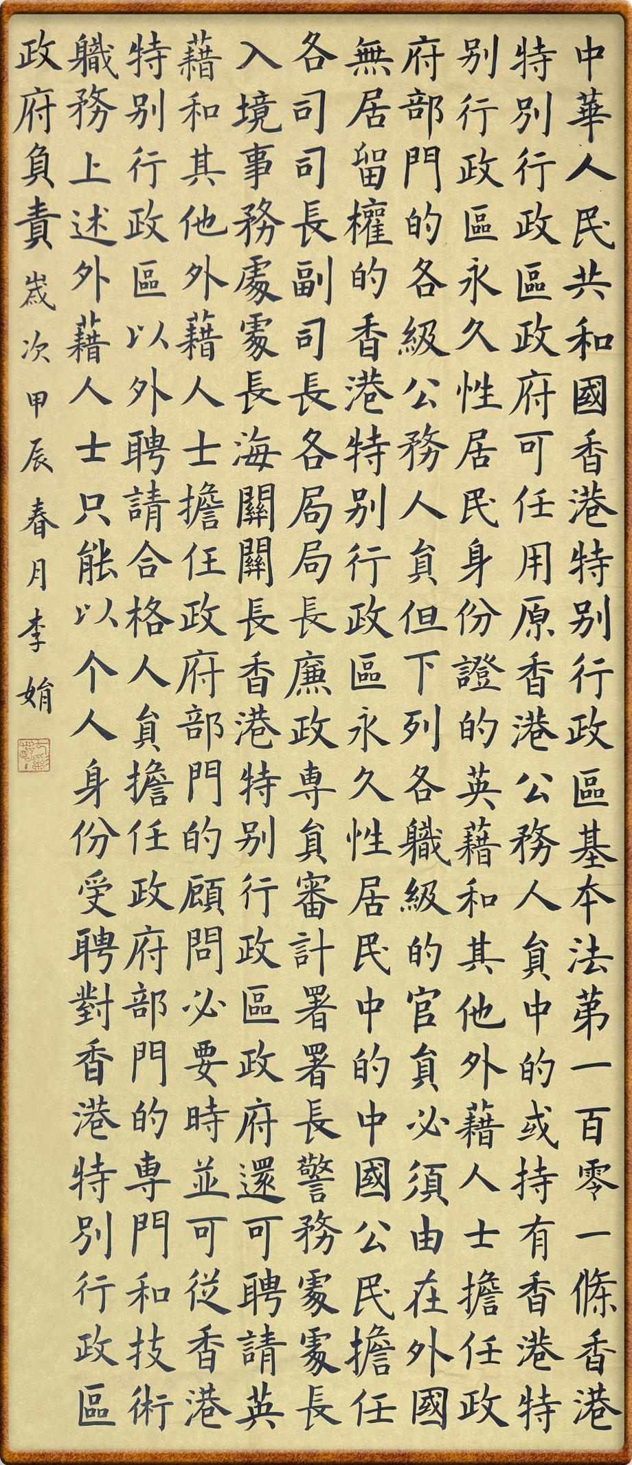 香港基本法第一百零一條 香港特別行政區(qū)政府可任用原香港公務(wù)人員中的或持有香港特別行政區(qū)永久性居民身份證的英籍和其他外籍人士擔(dān)任政府部門的各級(jí)公務(wù)人員,但下列各職級(jí)的官員必須由在外國無居留權(quán)的香港特別行政區(qū)永久性居民中的中國公民擔(dān)任:各司司長、副司長,各局局長,廉政專員,審計(jì)署署長,警務(wù)處處長,入境事務(wù)處處長,海關(guān)關(guān)長。
