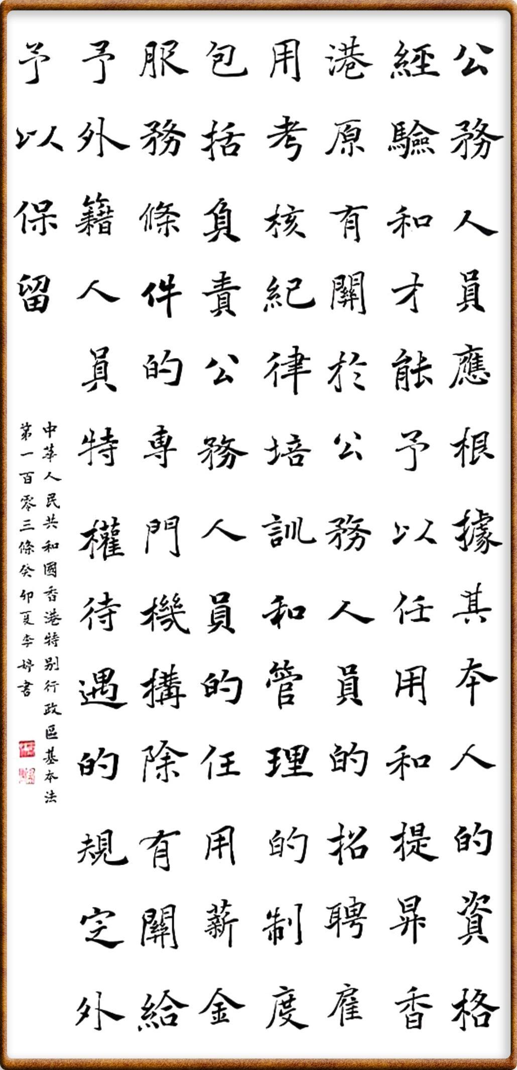 香港基本法第一百零三條 公務人員應根據(jù)其本人的資格、經(jīng)驗和才能予以任用和提升,香港原有關(guān)于公務人員的招聘、雇用、考核、紀律、培訓和管理的制度,包括負責公務人員的任用、薪金、服務條件的專門機構(gòu),除有關(guān)給予外籍人員特權(quán)待遇的規(guī)定外,予以保留。