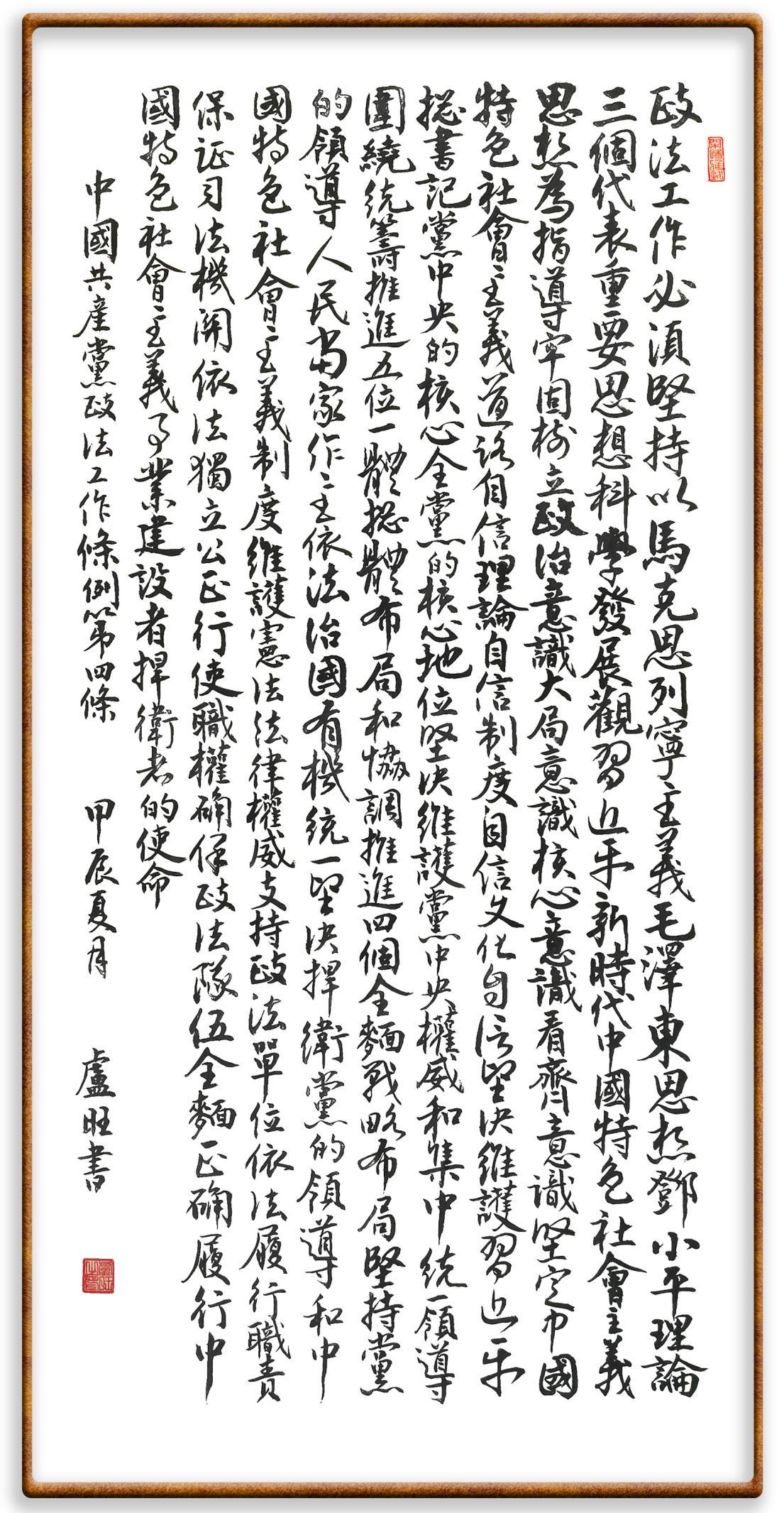 《中國共產(chǎn)黨政法工作條例》對黨領(lǐng)導(dǎo)新時代政法工作進(jìn)行全面制度擘畫,為黨領(lǐng)導(dǎo)政法工作提供基本遵循,具有重大而深遠(yuǎn)的意義。為學(xué)習(xí)好、宣傳好、貫徹好、實施好這部黨內(nèi)法規(guī),繼《中華人民共和國民法典》《中華人民共和國憲法》《信訪工作條例》《中華人民共和國澳門特別行政區(qū)基本法》《中華人民共和國香港特別行政區(qū)基本法》等法律法規(guī)之后,“書·法”系列活動將筆端對準(zhǔn)《中國共產(chǎn)黨政法工作條例》。