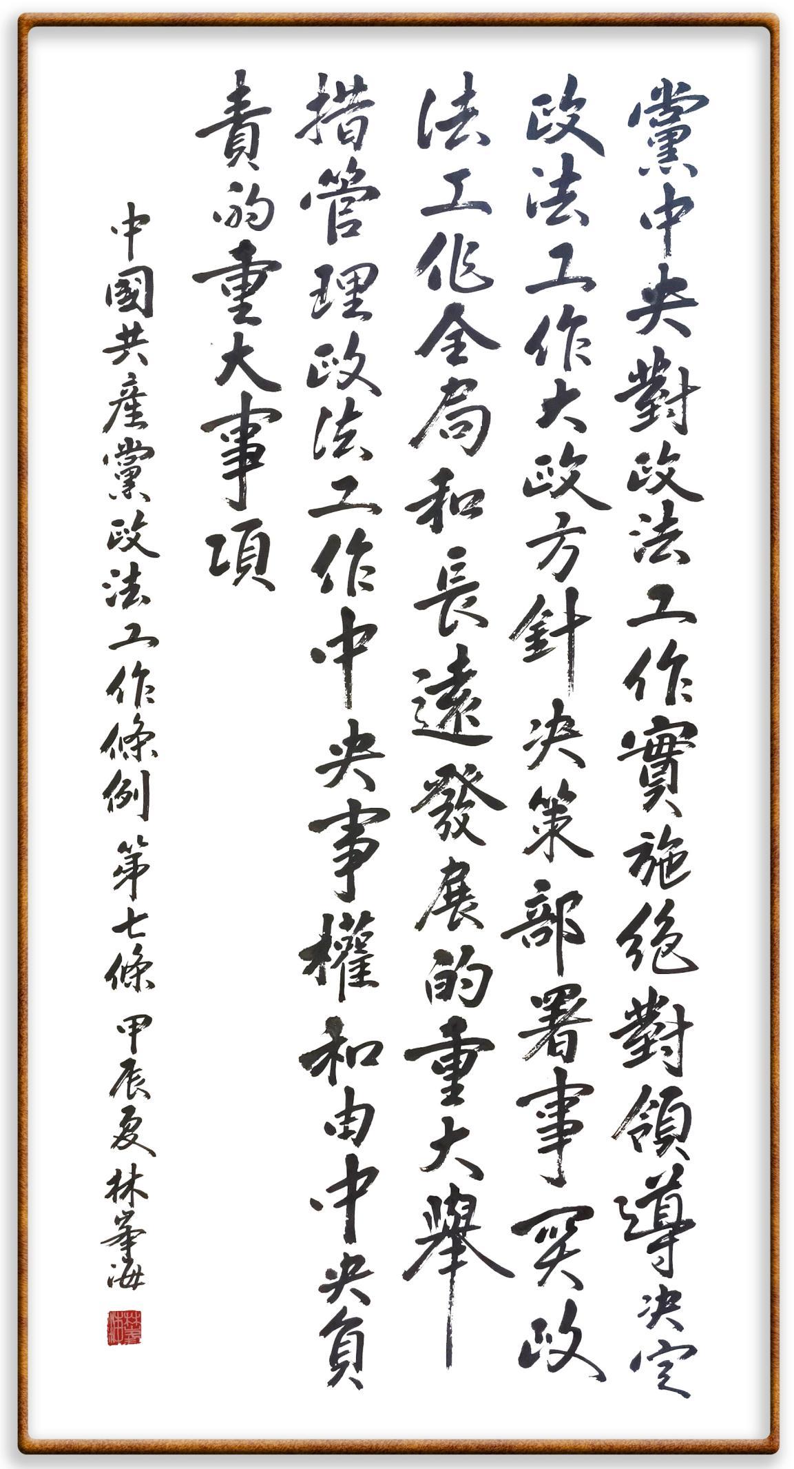 《中國共產黨政法工作條例》對黨領導新時代政法工作進行全面制度擘畫,為黨領導政法工作提供基本遵循,具有重大而深遠的意義。為學習好、宣傳好、貫徹好、實施好這部黨內法規(guī),繼《中華人民共和國民法典》《中華人民共和國憲法》《信訪工作條例》《中華人民共和國澳門特別行政區(qū)基本法》《中華人民共和國香港特別行政區(qū)基本法》等法律法規(guī)之后,“書·法”系列活動將筆端對準《中國共產黨政法工作條例》。