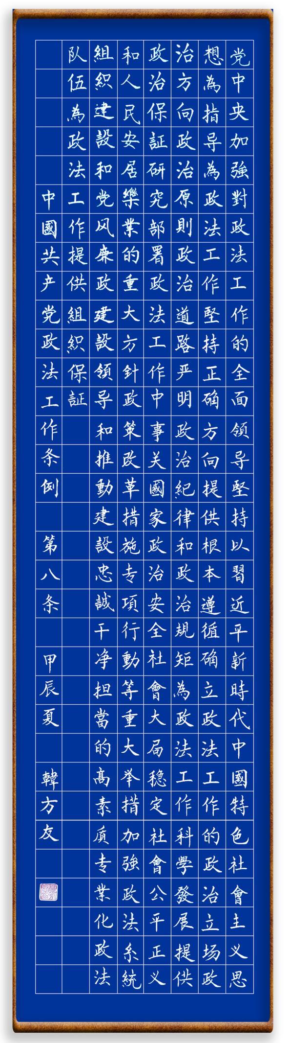 《中國共產(chǎn)黨政法工作條例》對黨領導新時代政法工作進行全面制度擘畫,為黨領導政法工作提供基本遵循,具有重大而深遠的意義。為學習好、宣傳好、貫徹好、實施好這部黨內(nèi)法規(guī),繼《中華人民共和國民法典》《中華人民共和國憲法》《信訪工作條例》《中華人民共和國澳門特別行政區(qū)基本法》《中華人民共和國香港特別行政區(qū)基本法》等法律法規(guī)之后,“書·法”系列活動將筆端對準《中國共產(chǎn)黨政法工作條例》。