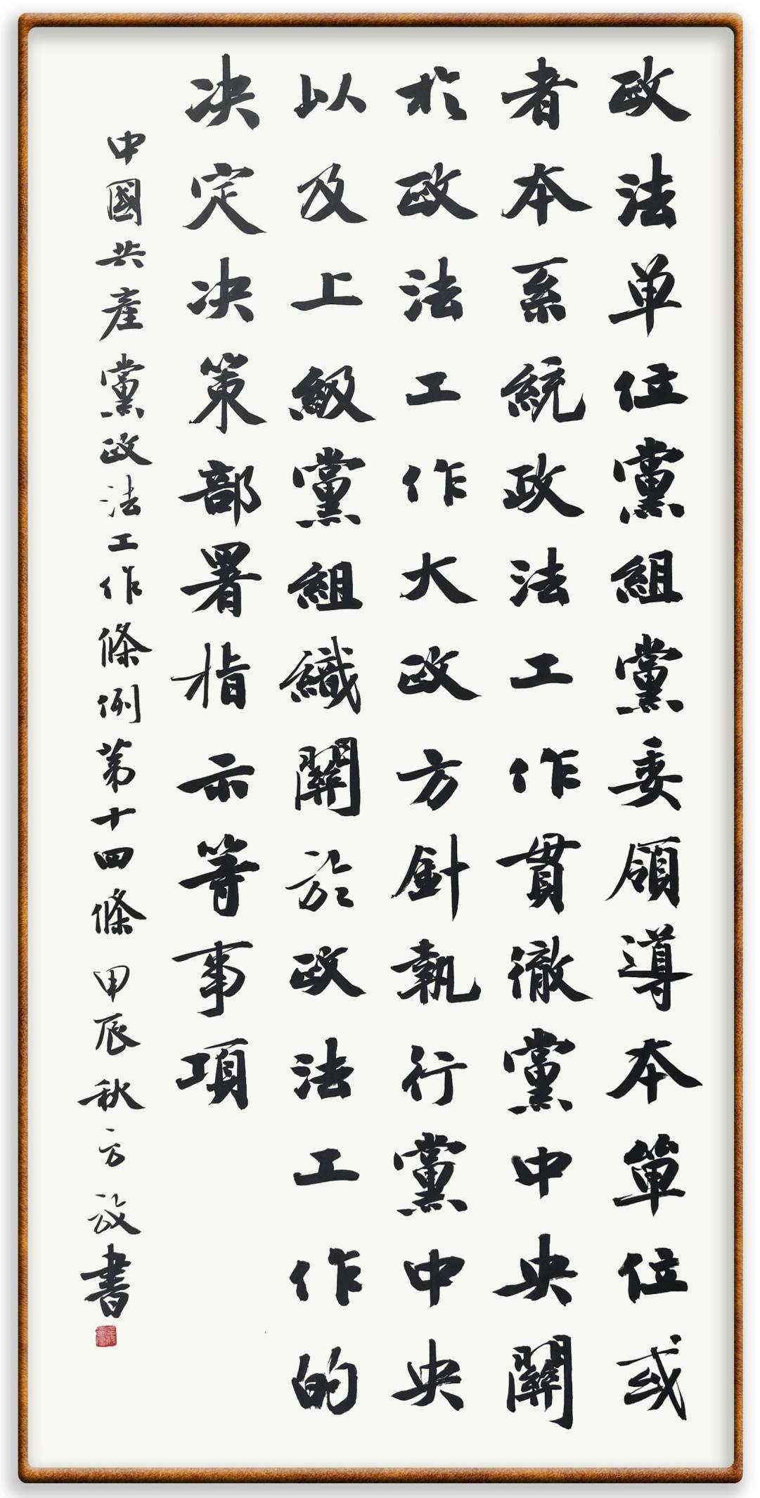 《中國(guó)共產(chǎn)黨政法工作條例》對(duì)黨領(lǐng)導(dǎo)新時(shí)代政法工作進(jìn)行全面制度擘畫,為黨領(lǐng)導(dǎo)政法工作提供基本遵循,具有重大而深遠(yuǎn)的意義。為學(xué)習(xí)好、宣傳好、貫徹好、實(shí)施好這部黨內(nèi)法規(guī),繼《中華人民共和國(guó)民法典》《中華人民共和國(guó)憲法》《信訪工作條例》《中華人民共和國(guó)澳門特別行政區(qū)基本法》《中華人民共和國(guó)香港特別行政區(qū)基本法》等法律法規(guī)之后,“書·法”系列活動(dòng)將筆端對(duì)準(zhǔn)《中國(guó)共產(chǎn)黨政法工作條例》。