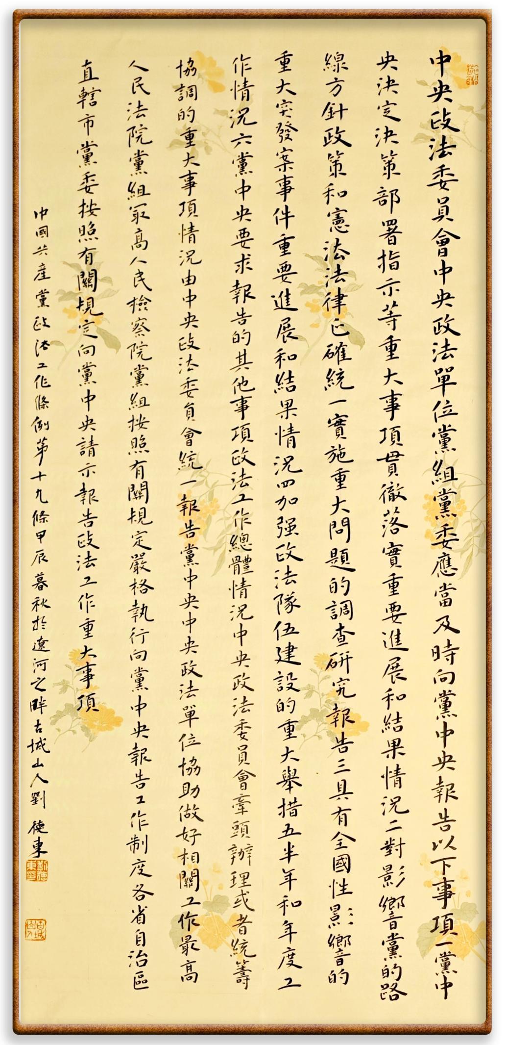 《中國共產(chǎn)黨政法工作條例》對黨領導新時代政法工作進行全面制度擘畫,為黨領導政法工作提供基本遵循,具有重大而深遠的意義。為學習好、宣傳好、貫徹好、實施好這部黨內(nèi)法規(guī),繼《中華人民共和國民法典》《中華人民共和國憲法》《信訪工作條例》《中華人民共和國澳門特別行政區(qū)基本法》《中華人民共和國香港特別行政區(qū)基本法》等法律法規(guī)之后,“書·法”系列活動將筆端對準《中國共產(chǎn)黨政法工作條例》。