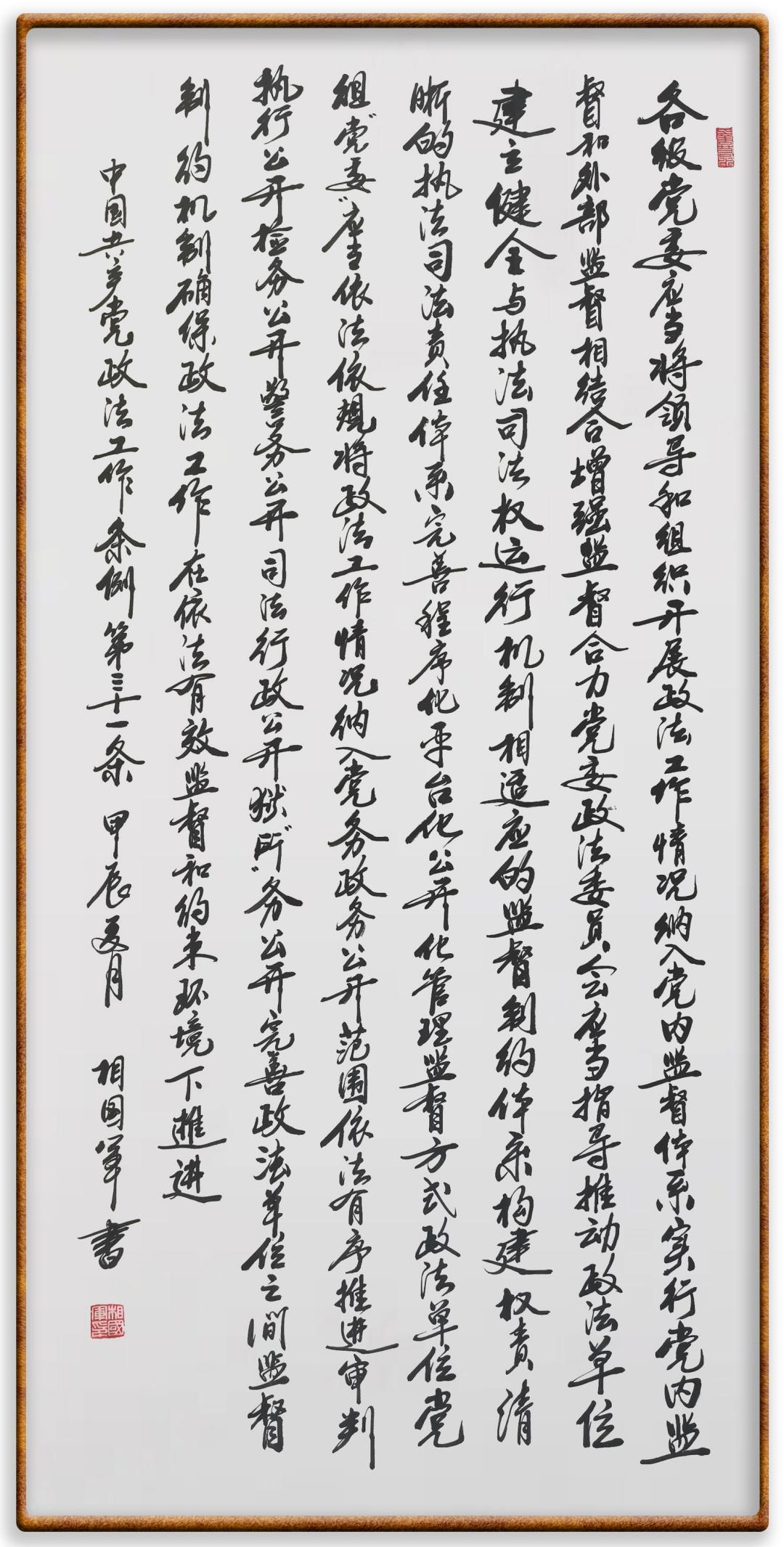 《中國(guó)共產(chǎn)黨政法工作條例》對(duì)黨領(lǐng)導(dǎo)新時(shí)代政法工作進(jìn)行全面制度擘畫,為黨領(lǐng)導(dǎo)政法工作提供基本遵循,具有重大而深遠(yuǎn)的意義。為學(xué)習(xí)好、宣傳好、貫徹好、實(shí)施好這部黨內(nèi)法規(guī),繼《中華人民共和國(guó)民法典》《中華人民共和國(guó)憲法》《信訪工作條例》《中華人民共和國(guó)澳門特別行政區(qū)基本法》《中華人民共和國(guó)香港特別行政區(qū)基本法》等法律法規(guī)之后,“書·法”系列活動(dòng)將筆端對(duì)準(zhǔn)《中國(guó)共產(chǎn)黨政法工作條例》。