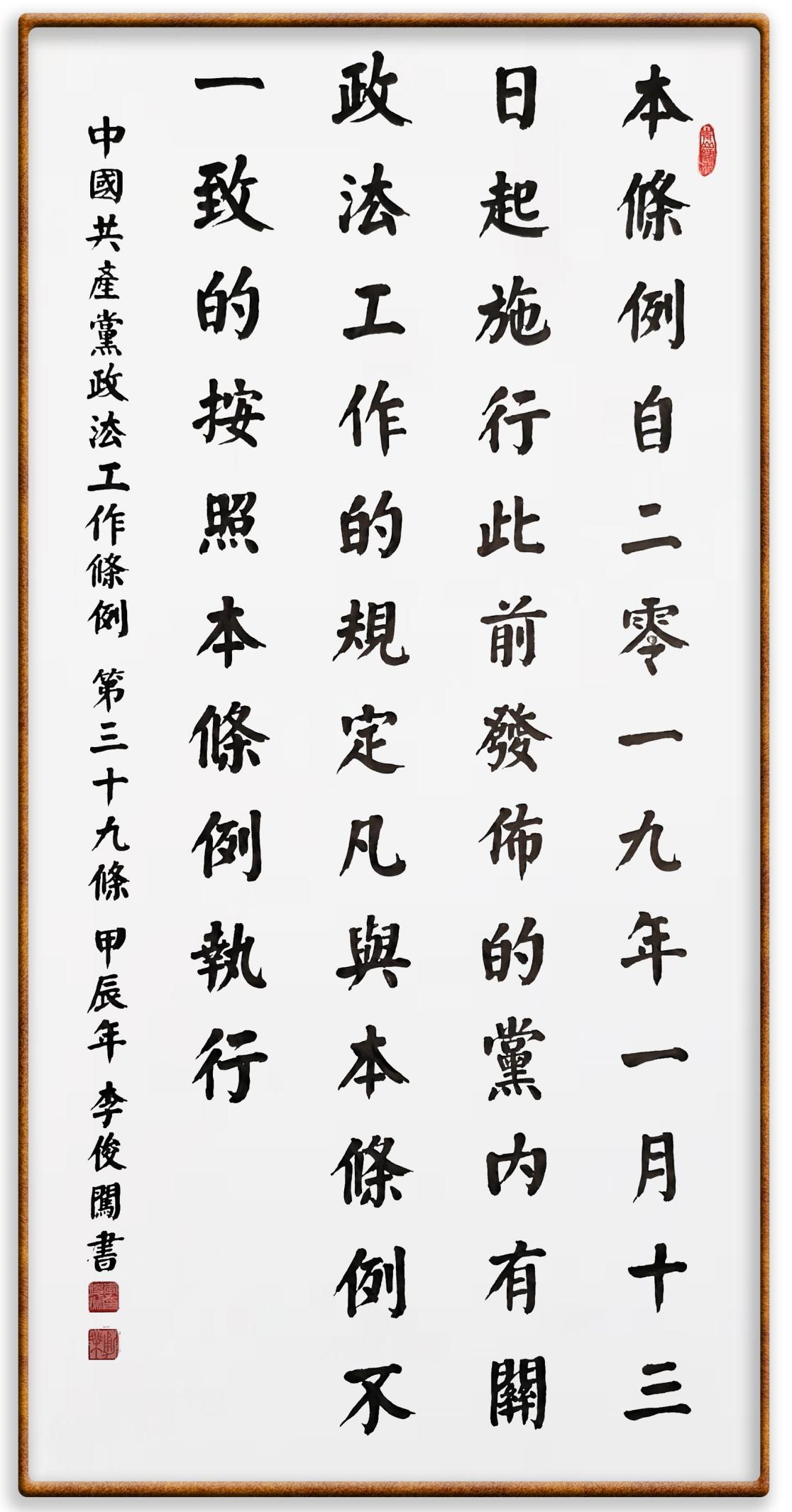 《中國共產黨政法工作條例》對黨領導新時代政法工作進行全面制度擘畫,為黨領導政法工作提供基本遵循,具有重大而深遠的意義。為學習好、宣傳好、貫徹好、實施好這部黨內法規(guī),繼《中華人民共和國民法典》《中華人民共和國憲法》《信訪工作條例》《中華人民共和國澳門特別行政區(qū)基本法》《中華人民共和國香港特別行政區(qū)基本法》等法律法規(guī)之后,“書·法”系列活動將筆端對準《中國共產黨政法工作條例》。