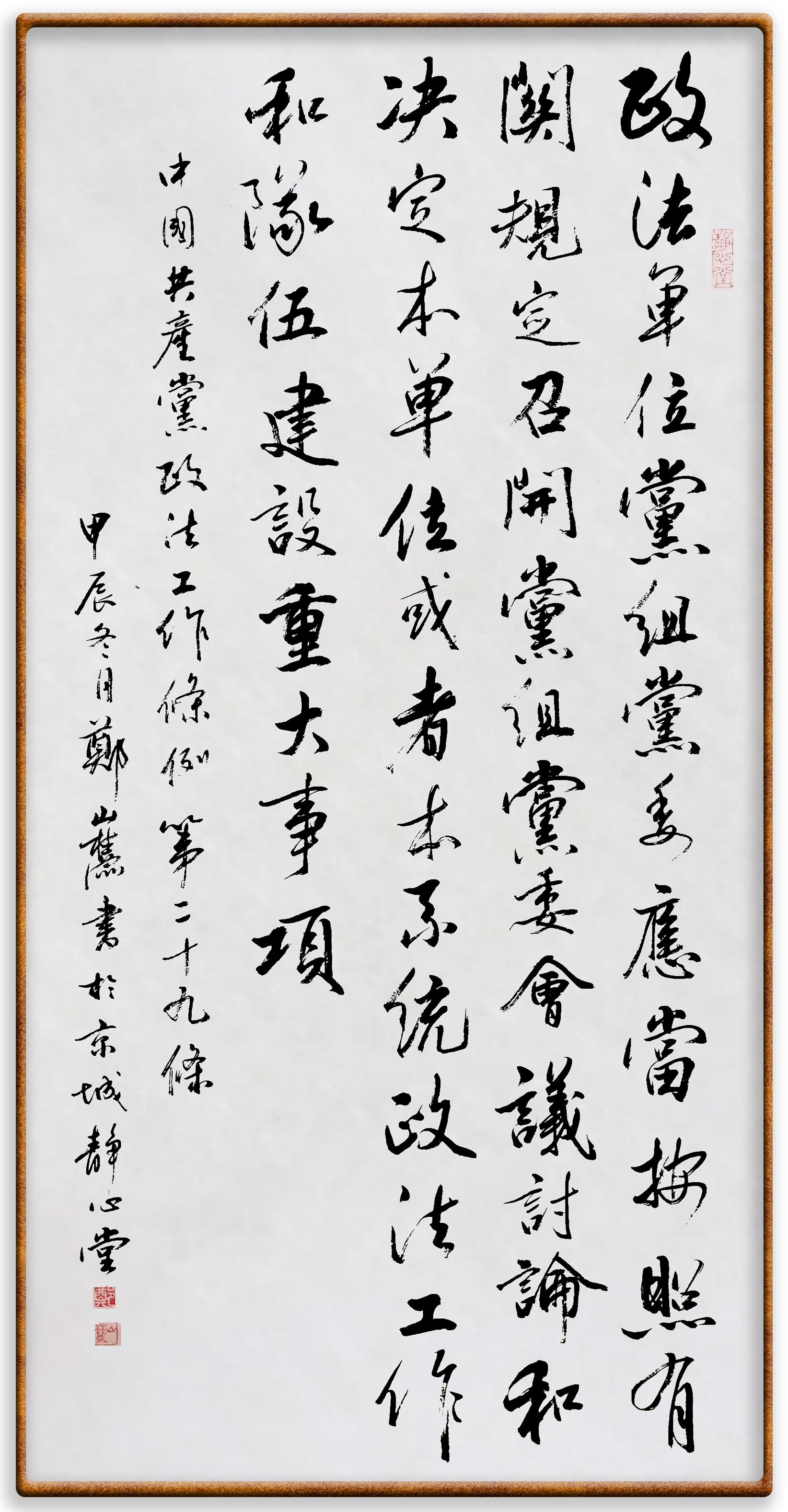 《中國共產(chǎn)黨政法工作條例》對黨領(lǐng)導(dǎo)新時代政法工作進行全面制度擘畫,為黨領(lǐng)導(dǎo)政法工作提供基本遵循,具有重大而深遠(yuǎn)的意義。為學(xué)習(xí)好、宣傳好、貫徹好、實施好這部黨內(nèi)法規(guī),繼《中華人民共和國民法典》《中華人民共和國憲法》《信訪工作條例》《中華人民共和國澳門特別行政區(qū)基本法》《中華人民共和國香港特別行政區(qū)基本法》等法律法規(guī)之后,“書·法”系列活動將筆端對準(zhǔn)《中國共產(chǎn)黨政法工作條例》。精彩內(nèi)容,敬請關(guān)注。