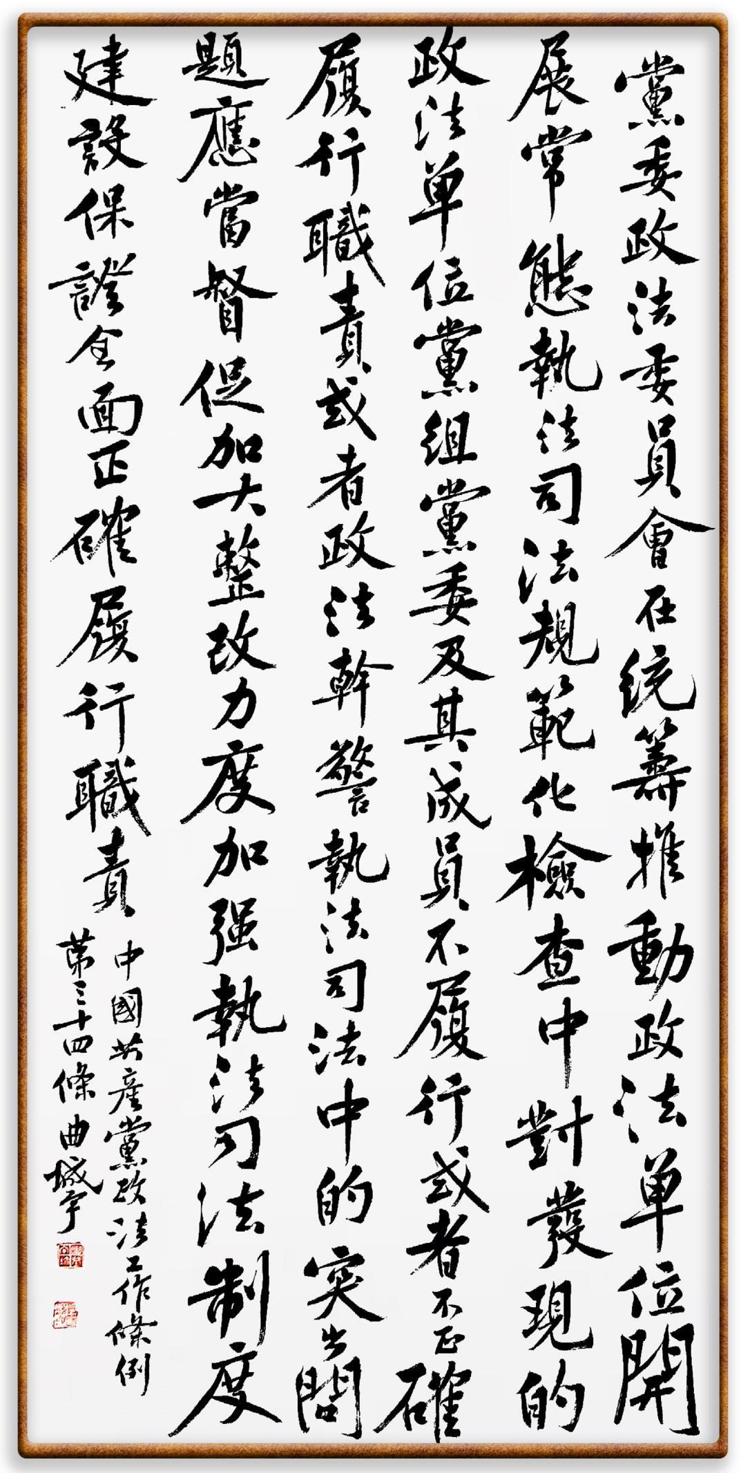 《中國共產(chǎn)黨政法工作條例》對黨領(lǐng)導(dǎo)新時代政法工作進行全面制度擘畫,為黨領(lǐng)導(dǎo)政法工作提供基本遵循,具有重大而深遠的意義。為學(xué)習(xí)好、宣傳好、貫徹好、實施好這部黨內(nèi)法規(guī),繼《中華人民共和國民法典》《中華人民共和國憲法》《信訪工作條例》《中華人民共和國澳門特別行政區(qū)基本法》《中華人民共和國香港特別行政區(qū)基本法》等法律法規(guī)之后,“書·法”系列活動將筆端對準《中國共產(chǎn)黨政法工作條例》。