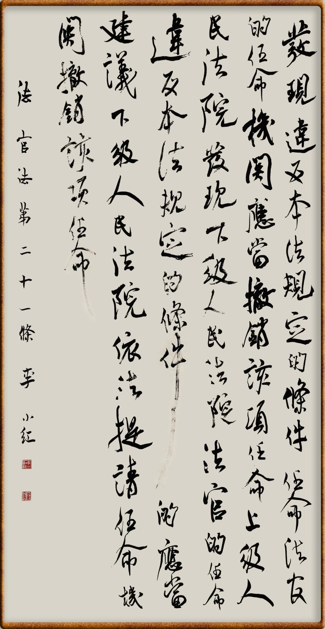 李小紅,中國(guó)法官文聯(lián)書(shū)法專業(yè)委員會(huì)會(huì)員,廣東省韶關(guān)市書(shū)法家協(xié)會(huì)會(huì)員,始興縣人民法院綜合辦公室干警。