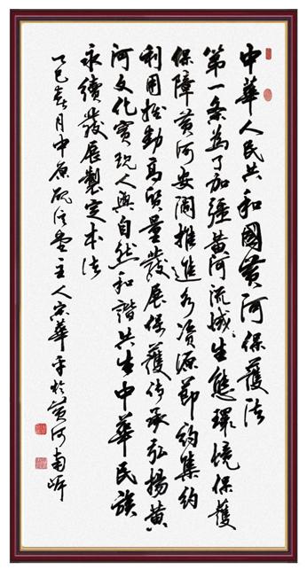 黃河寧,天下平。黃河是中華民族的發(fā)源地和搖籃,保護(hù)黃河是事關(guān)中華民族偉大復(fù)興的千秋大計(jì)。《中華人民共和國(guó)黃河保護(hù)法》為推進(jìn)水資源節(jié)約集約利用、保護(hù)傳承弘揚(yáng)黃河文化、推動(dòng)黃河流域生態(tài)保護(hù)和高質(zhì)量發(fā)展提供了有力法治保障。繼書(shū)寫(xiě)《中華人民共和國(guó)民法典》《中華人民共和國(guó)憲法》《中華人民共和國(guó)澳門(mén)特別行政區(qū)基本法》《中華人民共和國(guó)香港特別行政區(qū)基本法》《中華人民共和國(guó)國(guó)旗法》《中華人民共和國(guó)國(guó)徽法》《中華人民共和國(guó)國(guó)歌法》《中華人民共和國(guó)法官法》等法律之后,法制日?qǐng)?bào)社聯(lián)合沿黃九?。▍^(qū))司法廳、書(shū)法家協(xié)會(huì),將筆端對(duì)準(zhǔn)《中華人民共和國(guó)黃河保護(hù)法》。