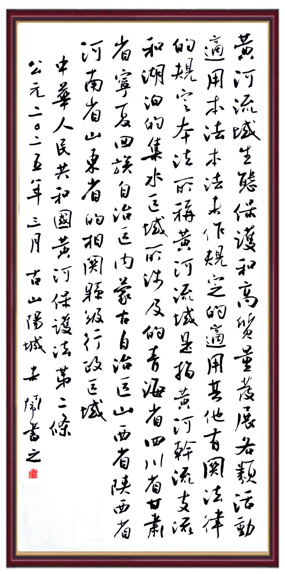黃河寧,天下平。黃河是中華民族的發(fā)源地和搖籃,保護(hù)黃河是事關(guān)中華民族偉大復(fù)興的千秋大計(jì)?!吨腥A人民共和國黃河保護(hù)法》為推進(jìn)水資源節(jié)約集約利用、保護(hù)傳承弘揚(yáng)黃河文化、推動(dòng)黃河流域生態(tài)保護(hù)和高質(zhì)量發(fā)展提供了有力法治保障。繼書寫《中華人民共和國民法典》《中華人民共和國憲法》《中華人民共和國澳門特別行政區(qū)基本法》《中華人民共和國香港特別行政區(qū)基本法》《中華人民共和國國旗法》《中華人民共和國國徽法》《中華人民共和國國歌法》《中華人民共和國法官法》等法律法規(guī)之后,法制日報(bào)社聯(lián)合沿黃九?。▍^(qū))司法廳、書法家協(xié)會(huì),將筆端對準(zhǔn)《中華人民共和國黃河保護(hù)法》。