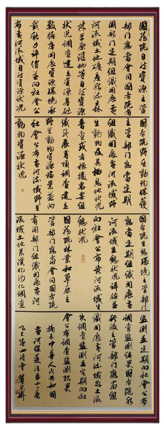 黃河寧,天下平。黃河是中華民族的發(fā)源地和搖籃,保護黃河是事關中華民族偉大復興的千秋大計?!吨腥A人民共和國黃河保護法》為推進水資源節(jié)約集約利用、保護傳承弘揚黃河文化、推動黃河流域生態(tài)保護和高質(zhì)量發(fā)展提供了有力法治保障。繼書寫《中華人民共和國民法典》《中華人民共和國憲法》《中華人民共和國澳門特別行政區(qū)基本法》《中華人民共和國香港特別行政區(qū)基本法》《中華人民共和國國旗法》《中華人民共和國國徽法》《中華人民共和國國歌法》《中華人民共和國法官法》等法律法規(guī)之后,法制日報社聯(lián)合沿黃九?。▍^(qū))司法廳、書法家協(xié)會,將筆端對準《中華人民共和國黃河保護法》。