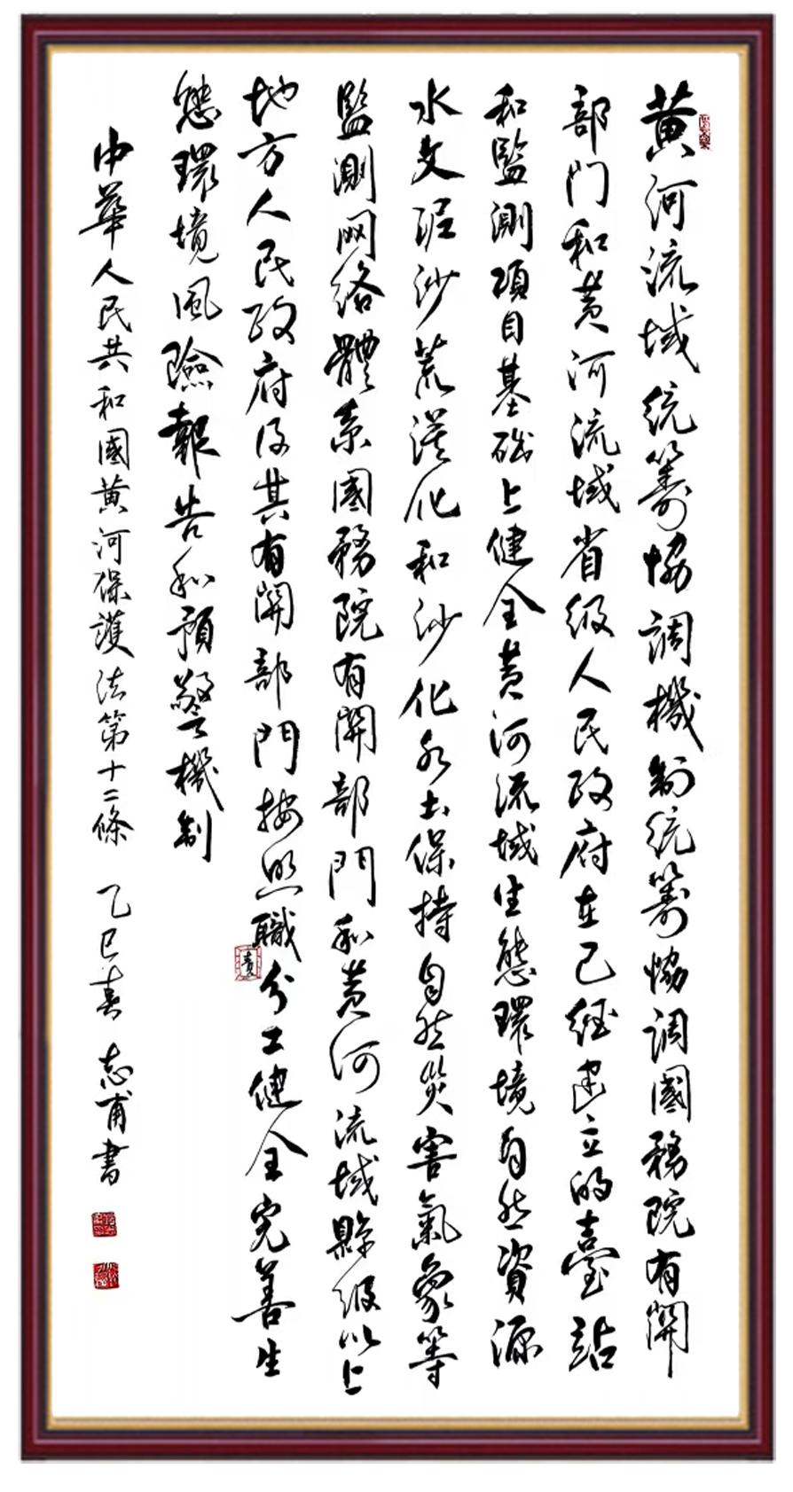 黃河寧,天下平。黃河是中華民族的發(fā)源地和搖籃,保護(hù)黃河是事關(guān)中華民族偉大復(fù)興的千秋大計(jì)?!吨腥A人民共和國黃河保護(hù)法》為推進(jìn)水資源節(jié)約集約利用、保護(hù)傳承弘揚(yáng)黃河文化、推動(dòng)黃河流域生態(tài)保護(hù)和高質(zhì)量發(fā)展提供了有力法治保障。繼書寫《中華人民共和國民法典》《中華人民共和國憲法》《中華人民共和國澳門特別行政區(qū)基本法》《中華人民共和國香港特別行政區(qū)基本法》《中華人民共和國國旗法》《中華人民共和國國徽法》《中華人民共和國國歌法》《中華人民共和國法官法》等法律法規(guī)之后,法制日?qǐng)?bào)社聯(lián)合沿黃九?。▍^(qū))司法廳、書法家協(xié)會(huì),將筆端對(duì)準(zhǔn)《中華人民共和國黃河保護(hù)法》。
