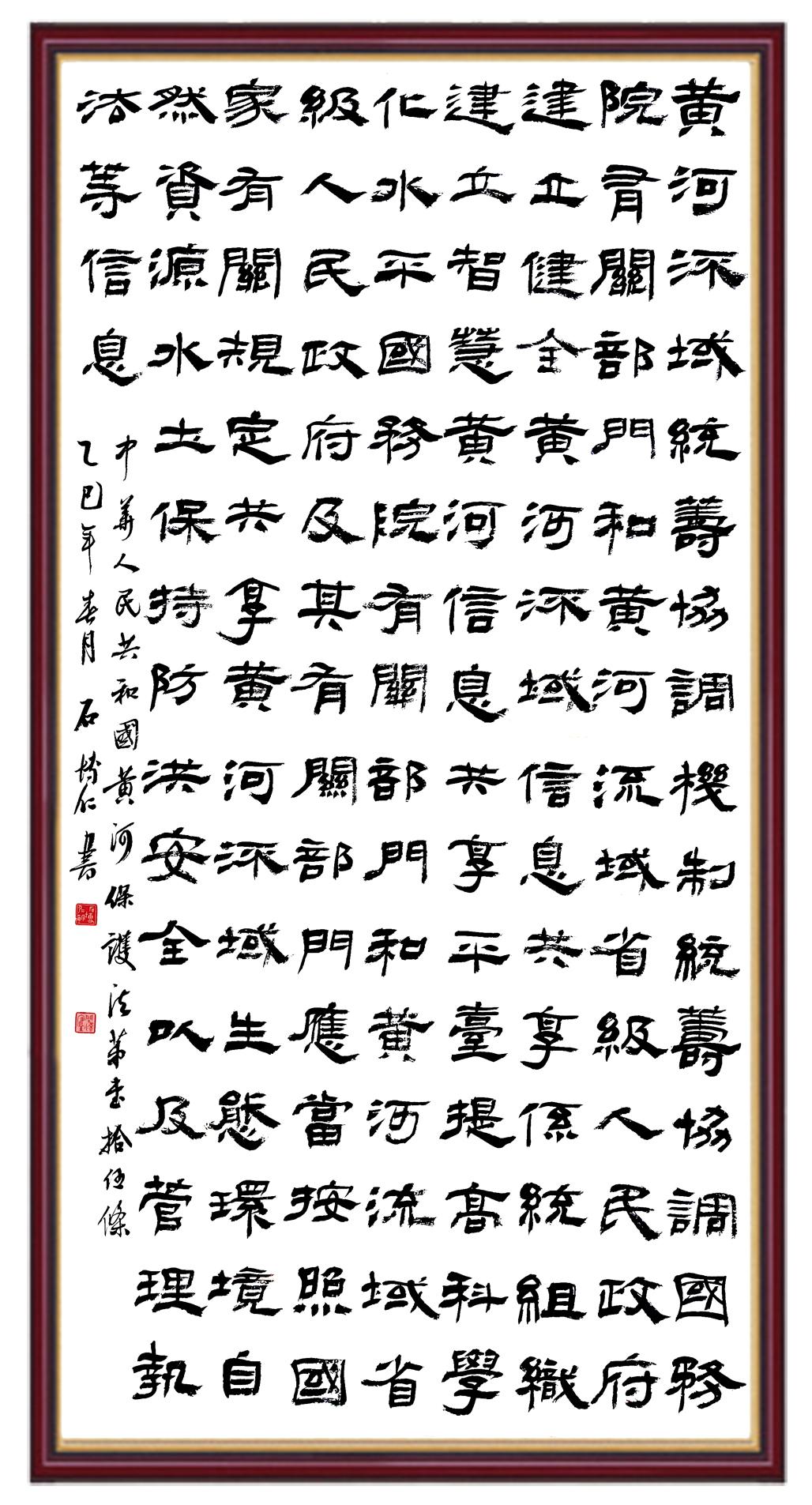 黃河寧,天下平。黃河是中華民族的發(fā)源地和搖籃,保護黃河是事關(guān)中華民族偉大復(fù)興的千秋大計?!吨腥A人民共和國黃河保護法》為推進水資源節(jié)約集約利用、保護傳承弘揚黃河文化、推動黃河流域生態(tài)保護和高質(zhì)量發(fā)展提供了有力法治保障。繼書寫《中華人民共和國民法典》《中華人民共和國憲法》《中華人民共和國澳門特別行政區(qū)基本法》《中華人民共和國香港特別行政區(qū)基本法》《中華人民共和國國旗法》《中華人民共和國國徽法》《中華人民共和國國歌法》《中華人民共和國法官法》等法律法規(guī)之后,法制日報社聯(lián)合沿黃九?。▍^(qū))司法廳、書法家協(xié)會,將筆端對準(zhǔn)《中華人民共和國黃河保護法》。