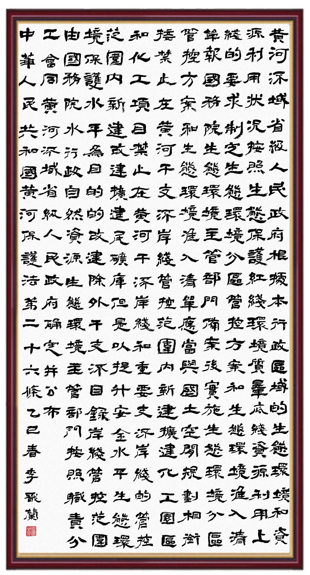 黃河寧,天下平。黃河是中華民族的發(fā)源地和搖籃,保護黃河是事關(guān)中華民族偉大復興的千秋大計。《中華人民共和國黃河保護法》為推進水資源節(jié)約集約利用、保護傳承弘揚黃河文化、推動黃河流域生態(tài)保護和高質(zhì)量發(fā)展提供了有力法治保障。繼書寫《中華人民共和國民法典》《中華人民共和國憲法》《中華人民共和國澳門特別行政區(qū)基本法》《中華人民共和國香港特別行政區(qū)基本法》《中華人民共和國國旗法》《中華人民共和國國徽法》《中華人民共和國國歌法》《中華人民共和國法官法》等法律法規(guī)之后,法制日報社聯(lián)合沿黃九?。▍^(qū))司法廳、書法家協(xié)會,將筆端對準《中華人民共和國黃河保護法》。