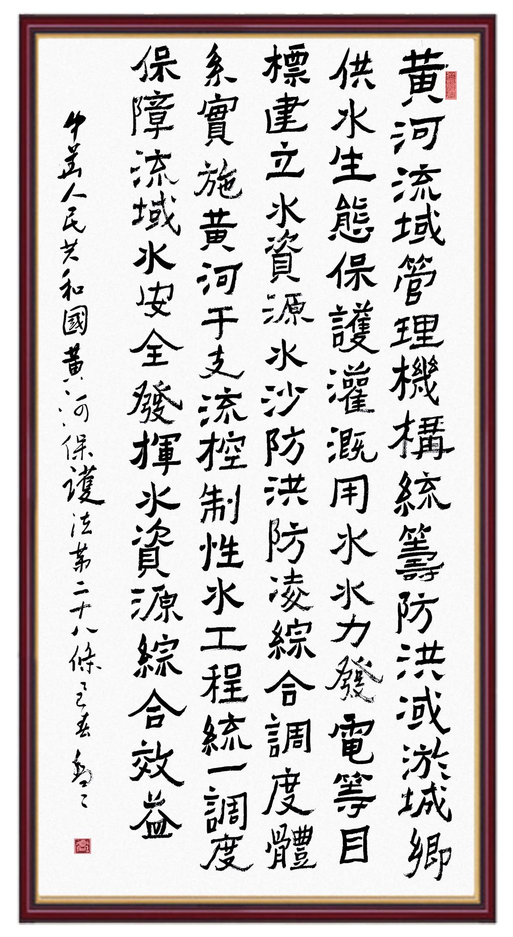 黃河寧,天下平。黃河是中華民族的發(fā)源地和搖籃,保護黃河是事關中華民族偉大復興的千秋大計?!吨腥A人民共和國黃河保護法》為推進水資源節(jié)約集約利用、保護傳承弘揚黃河文化、推動黃河流域生態(tài)保護和高質(zhì)量發(fā)展提供了有力法治保障。繼書寫《中華人民共和國民法典》《中華人民共和國憲法》《中華人民共和國澳門特別行政區(qū)基本法》《中華人民共和國香港特別行政區(qū)基本法》《中華人民共和國國旗法》《中華人民共和國國徽法》《中華人民共和國國歌法》《中華人民共和國法官法》等法律法規(guī)之后,法制日報社聯(lián)合沿黃九省(區(qū))司法廳、書法家協(xié)會,將筆端對準《中華人民共和國黃河保護法》。