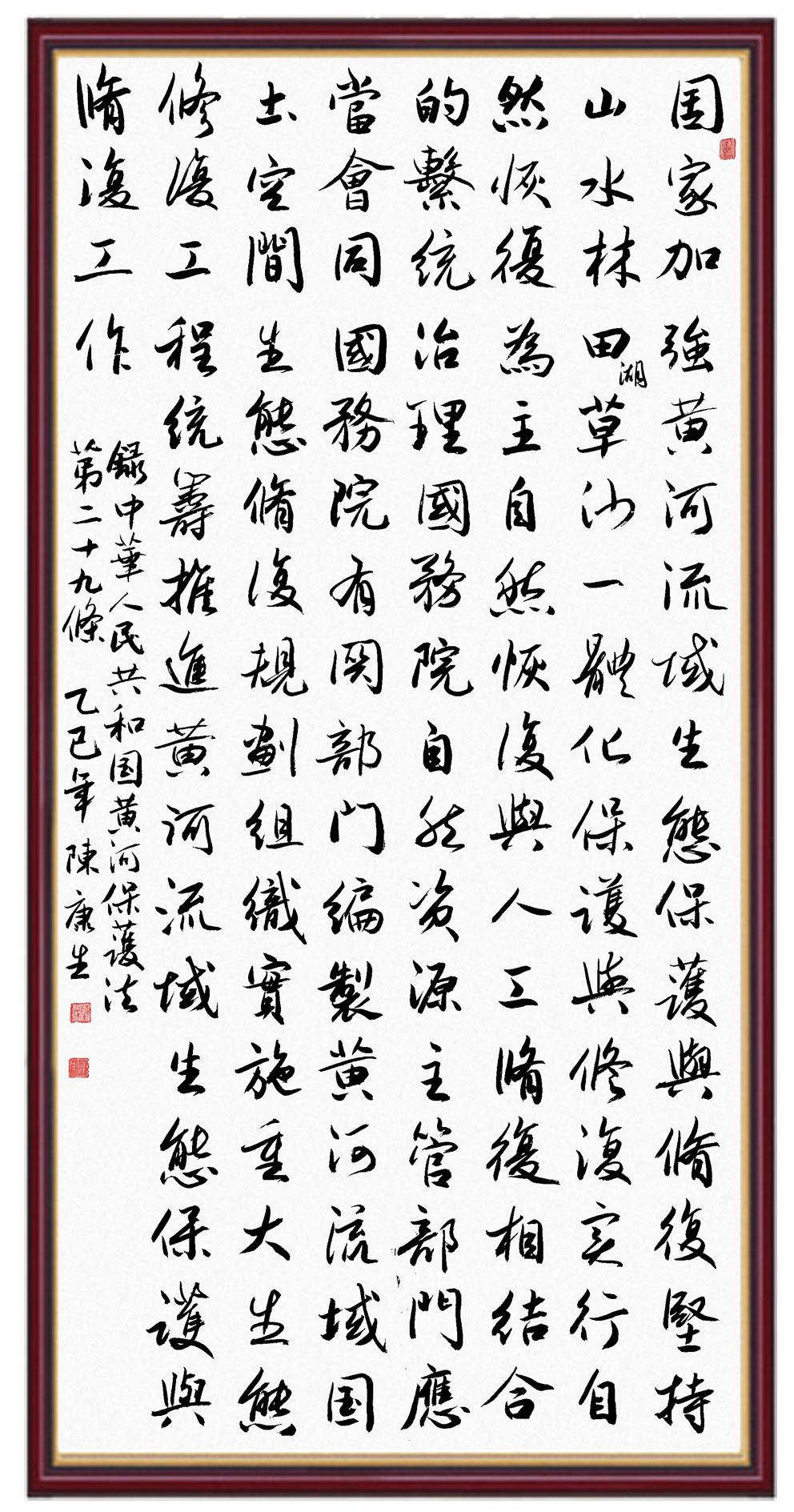黃河寧,天下平。黃河是中華民族的發(fā)源地和搖籃,保護(hù)黃河是事關(guān)中華民族偉大復(fù)興的千秋大計(jì)。《中華人民共和國(guó)黃河保護(hù)法》為推進(jìn)水資源節(jié)約集約利用、保護(hù)傳承弘揚(yáng)黃河文化、推動(dòng)黃河流域生態(tài)保護(hù)和高質(zhì)量發(fā)展提供了有力法治保障。繼書(shū)寫(xiě)《中華人民共和國(guó)民法典》《中華人民共和國(guó)憲法》《中華人民共和國(guó)澳門(mén)特別行政區(qū)基本法》《中華人民共和國(guó)香港特別行政區(qū)基本法》《中華人民共和國(guó)國(guó)旗法》《中華人民共和國(guó)國(guó)徽法》《中華人民共和國(guó)國(guó)歌法》《中華人民共和國(guó)法官法》等法律法規(guī)之后,法制日?qǐng)?bào)社聯(lián)合沿黃九?。▍^(qū))司法廳、書(shū)法家協(xié)會(huì),將筆端對(duì)準(zhǔn)《中華人民共和國(guó)黃河保護(hù)法》。