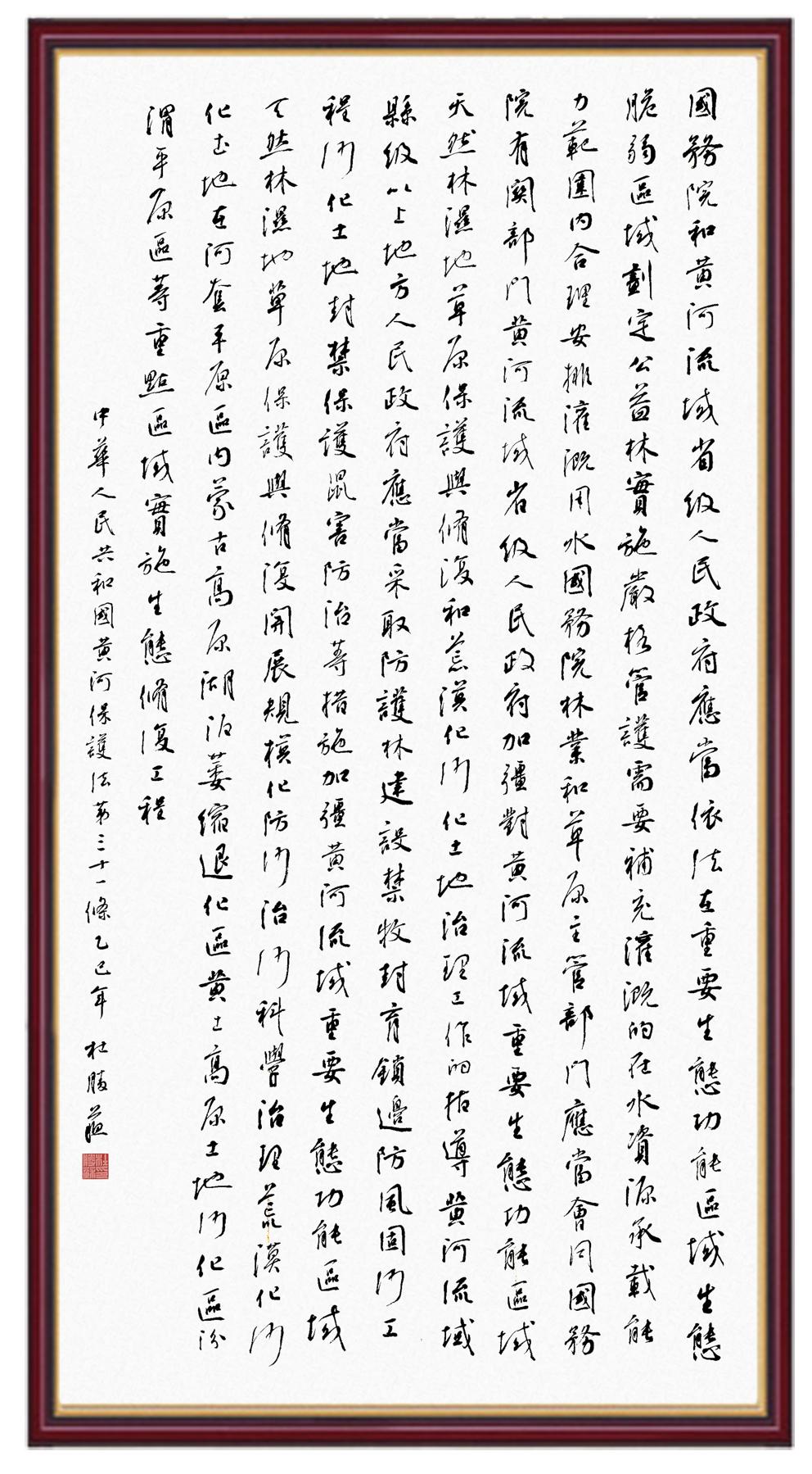 黃河寧,天下平。黃河是中華民族的發(fā)源地和搖籃,保護(hù)黃河是事關(guān)中華民族偉大復(fù)興的千秋大計(jì)?!吨腥A人民共和國黃河保護(hù)法》為推進(jìn)水資源節(jié)約集約利用、保護(hù)傳承弘揚(yáng)黃河文化、推動黃河流域生態(tài)保護(hù)和高質(zhì)量發(fā)展提供了有力法治保障。繼書寫《中華人民共和國民法典》《中華人民共和國憲法》《中華人民共和國澳門特別行政區(qū)基本法》《中華人民共和國香港特別行政區(qū)基本法》《中華人民共和國國旗法》《中華人民共和國國徽法》《中華人民共和國國歌法》《中華人民共和國法官法》等法律法規(guī)之后,法制日報社聯(lián)合沿黃九?。▍^(qū))司法廳、書法家協(xié)會,將筆端對準(zhǔn)《中華人民共和國黃河保護(hù)法》。