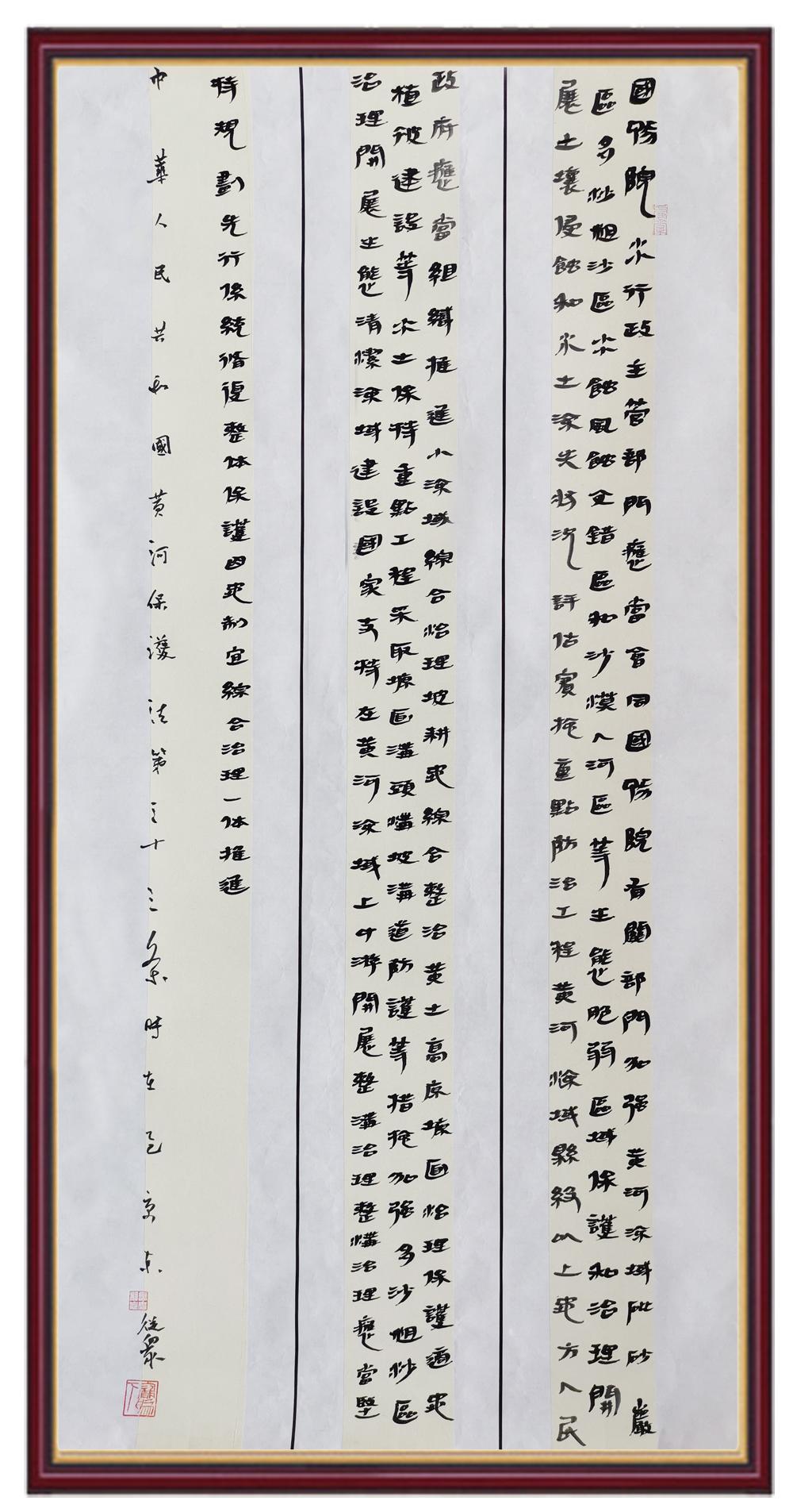 黃河寧,天下平。黃河是中華民族的發(fā)源地和搖籃,保護黃河是事關中華民族偉大復興的千秋大計?!吨腥A人民共和國黃河保護法》為推進水資源節(jié)約集約利用、保護傳承弘揚黃河文化、推動黃河流域生態(tài)保護和高質量發(fā)展提供了有力法治保障。繼書寫《中華人民共和國民法典》《中華人民共和國憲法》《中華人民共和國澳門特別行政區(qū)基本法》《中華人民共和國香港特別行政區(qū)基本法》《中華人民共和國國旗法》《中華人民共和國國徽法》《中華人民共和國國歌法》《中華人民共和國法官法》等法律法規(guī)之后,法制日報社聯(lián)合沿黃九?。▍^(qū))司法廳、書法家協(xié)會,將筆端對準《中華人民共和國黃河保護法》。