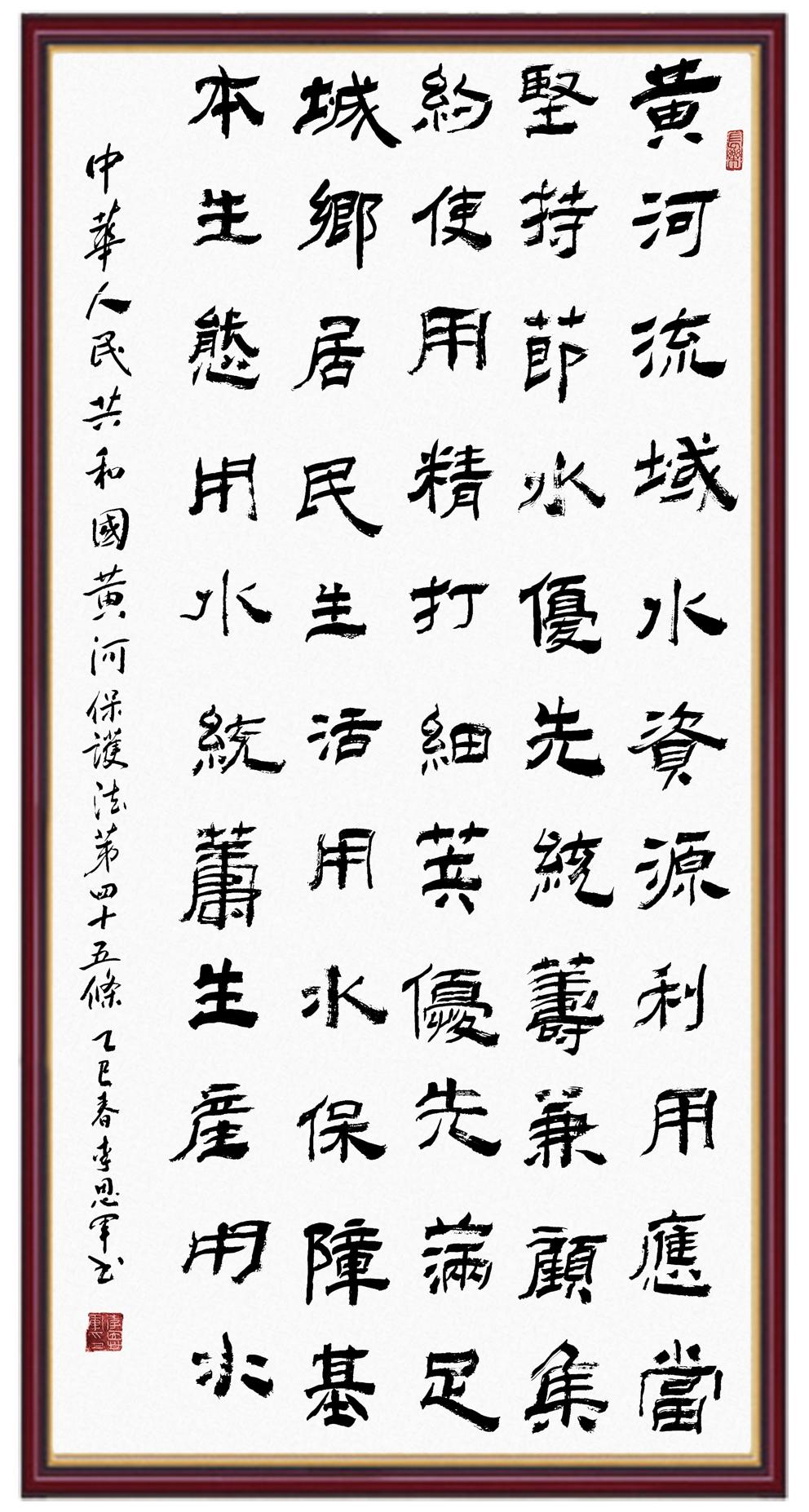 黃河寧,天下平。黃河是中華民族的發(fā)源地和搖籃,保護黃河是事關(guān)中華民族偉大復興的千秋大計?!吨腥A人民共和國黃河保護法》為推進水資源節(jié)約集約利用、保護傳承弘揚黃河文化、推動黃河流域生態(tài)保護和高質(zhì)量發(fā)展提供了有力法治保障。繼書寫《中華人民共和國民法典》《中華人民共和國憲法》《中華人民共和國澳門特別行政區(qū)基本法》《中華人民共和國香港特別行政區(qū)基本法》《中華人民共和國國旗法》《中華人民共和國國徽法》《中華人民共和國國歌法》《中華人民共和國法官法》等法律法規(guī)之后,法制日報社聯(lián)合沿黃九省(區(qū))司法廳、書法家協(xié)會,將筆端對準《中華人民共和國黃河保護法》。