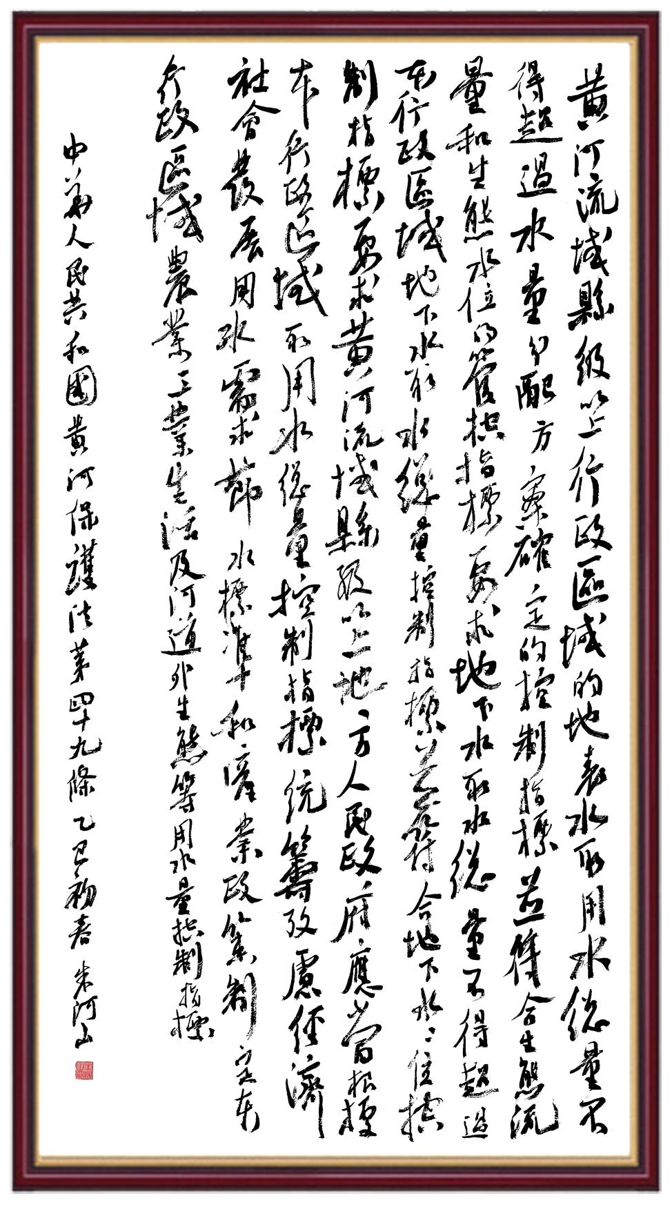 黃河寧,天下平。黃河是中華民族的發(fā)源地和搖籃,保護(hù)黃河是事關(guān)中華民族偉大復(fù)興的千秋大計(jì)。《中華人民共和國(guó)黃河保護(hù)法》為推進(jìn)水資源節(jié)約集約利用、保護(hù)傳承弘揚(yáng)黃河文化、推動(dòng)黃河流域生態(tài)保護(hù)和高質(zhì)量發(fā)展提供了有力法治保障。繼書寫《中華人民共和國(guó)民法典》《中華人民共和國(guó)憲法》《中華人民共和國(guó)澳門特別行政區(qū)基本法》《中華人民共和國(guó)香港特別行政區(qū)基本法》《中華人民共和國(guó)國(guó)旗法》《中華人民共和國(guó)國(guó)徽法》《中華人民共和國(guó)國(guó)歌法》《中華人民共和國(guó)法官法》等法律法規(guī)之后,法制日?qǐng)?bào)社聯(lián)合沿黃九?。▍^(qū))司法廳、書法家協(xié)會(huì),將筆端對(duì)準(zhǔn)《中華人民共和國(guó)黃河保護(hù)法》。