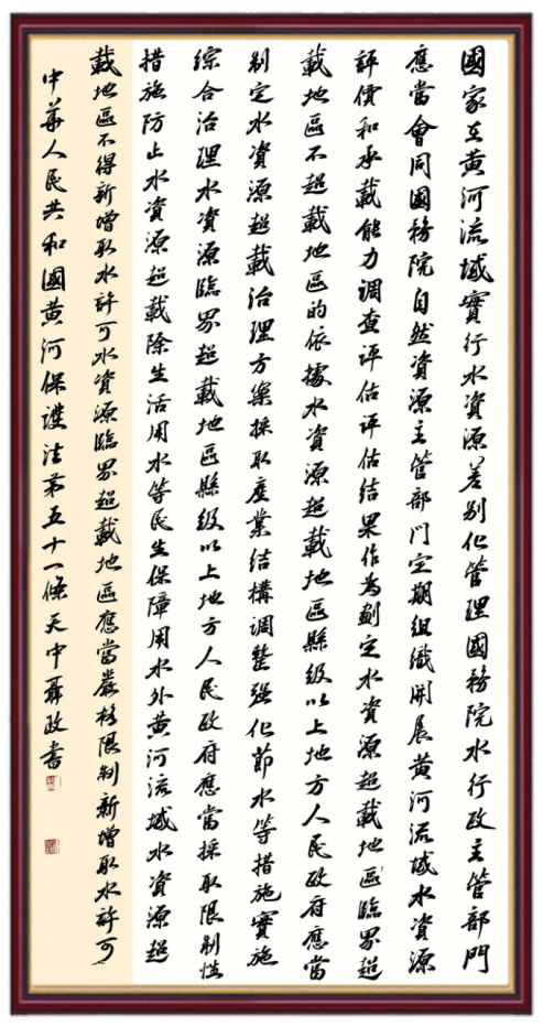 黃河寧,天下平。黃河是中華民族的發(fā)源地和搖籃,保護(hù)黃河是事關(guān)中華民族偉大復(fù)興的千秋大計(jì)。《中華人民共和國(guó)黃河保護(hù)法》為推進(jìn)水資源節(jié)約集約利用、保護(hù)傳承弘揚(yáng)黃河文化、推動(dòng)黃河流域生態(tài)保護(hù)和高質(zhì)量發(fā)展提供了有力法治保障。繼書寫《中華人民共和國(guó)民法典》《中華人民共和國(guó)憲法》《中華人民共和國(guó)澳門特別行政區(qū)基本法》《中華人民共和國(guó)香港特別行政區(qū)基本法》《中華人民共和國(guó)國(guó)旗法》《中華人民共和國(guó)國(guó)徽法》《中華人民共和國(guó)國(guó)歌法》《中華人民共和國(guó)法官法》等法律法規(guī)之后,法制日?qǐng)?bào)社聯(lián)合沿黃九?。▍^(qū))司法廳、書法家協(xié)會(huì),將筆端對(duì)準(zhǔn)《中華人民共和國(guó)黃河保護(hù)法》。