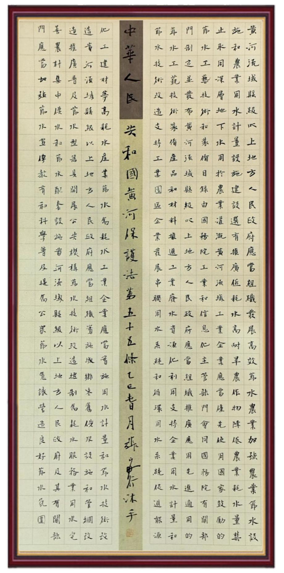 黃河寧,天下平。黃河是中華民族的發(fā)源地和搖籃,保護(hù)黃河是事關(guān)中華民族偉大復(fù)興的千秋大計(jì)。《中華人民共和國(guó)黃河保護(hù)法》為推進(jìn)水資源節(jié)約集約利用、保護(hù)傳承弘揚(yáng)黃河文化、推動(dòng)黃河流域生態(tài)保護(hù)和高質(zhì)量發(fā)展提供了有力法治保障。繼書寫《中華人民共和國(guó)民法典》《中華人民共和國(guó)憲法》《中華人民共和國(guó)澳門特別行政區(qū)基本法》《中華人民共和國(guó)香港特別行政區(qū)基本法》《中華人民共和國(guó)國(guó)旗法》《中華人民共和國(guó)國(guó)徽法》《中華人民共和國(guó)國(guó)歌法》《中華人民共和國(guó)法官法》等法律法規(guī)之后,法制日?qǐng)?bào)社聯(lián)合沿黃九?。▍^(qū))司法廳、書法家協(xié)會(huì),將筆端對(duì)準(zhǔn)《中華人民共和國(guó)黃河保護(hù)法》。