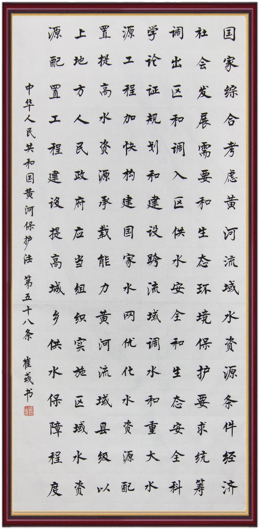 黃河寧,天下平。黃河是中華民族的發(fā)源地和搖籃,保護(hù)黃河是事關(guān)中華民族偉大復(fù)興的千秋大計(jì)?!吨腥A人民共和國黃河保護(hù)法》為推進(jìn)水資源節(jié)約集約利用、保護(hù)傳承弘揚(yáng)黃河文化、推動(dòng)黃河流域生態(tài)保護(hù)和高質(zhì)量發(fā)展提供了有力法治保障。繼書寫《中華人民共和國民法典》《中華人民共和國憲法》《中華人民共和國澳門特別行政區(qū)基本法》《中華人民共和國香港特別行政區(qū)基本法》《中華人民共和國國旗法》《中華人民共和國國徽法》《中華人民共和國國歌法》《中華人民共和國法官法》等法律法規(guī)之后,法制日報(bào)社聯(lián)合沿黃九?。▍^(qū))司法廳、書法家協(xié)會(huì),將筆端對準(zhǔn)《中華人民共和國黃河保護(hù)法》。