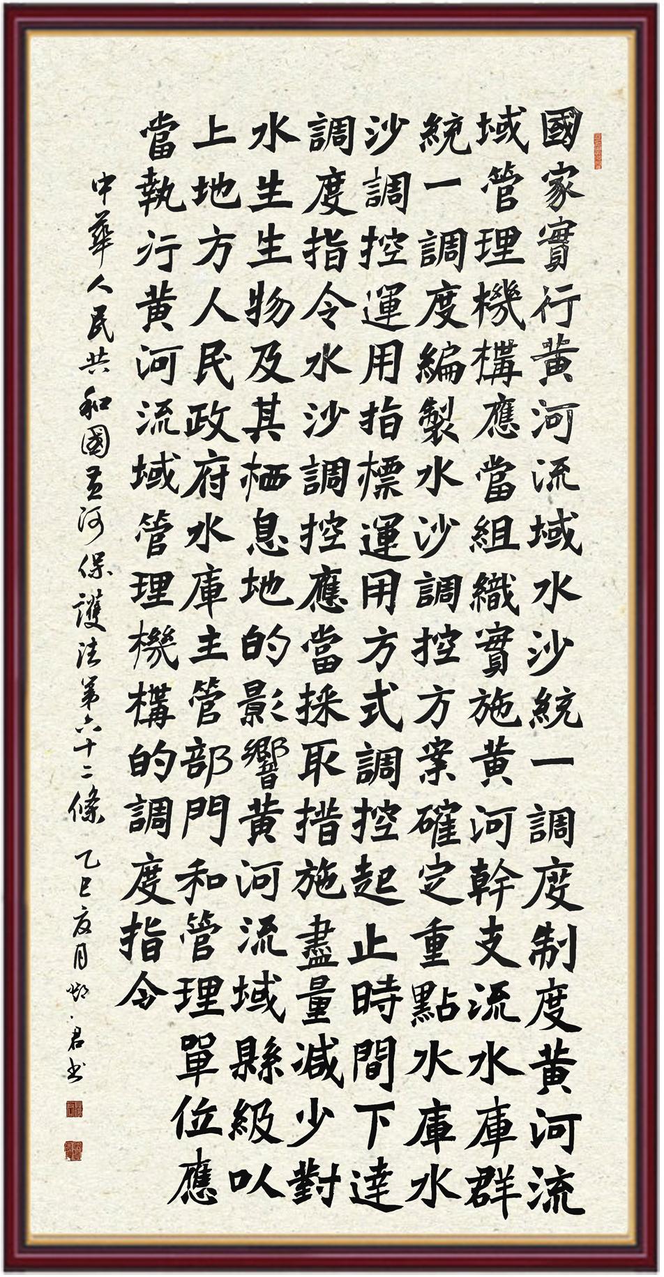 黃河寧,天下平。黃河是中華民族的發(fā)源地和搖籃,保護(hù)黃河是事關(guān)中華民族偉大復(fù)興的千秋大計(jì)。《中華人民共和國黃河保護(hù)法》為推進(jìn)水資源節(jié)約集約利用、保護(hù)傳承弘揚(yáng)黃河文化、推動黃河流域生態(tài)保護(hù)和高質(zhì)量發(fā)展提供了有力法治保障。繼書寫《中華人民共和國民法典》《中華人民共和國憲法》《中華人民共和國澳門特別行政區(qū)基本法》《中華人民共和國香港特別行政區(qū)基本法》《中華人民共和國國旗法》《中華人民共和國國徽法》《中華人民共和國國歌法》《中華人民共和國法官法》等法律法規(guī)之后,法制日報(bào)社聯(lián)合沿黃九?。▍^(qū))司法廳、書法家協(xié)會,將筆端對準(zhǔn)《中華人民共和國黃河保護(hù)法》。
