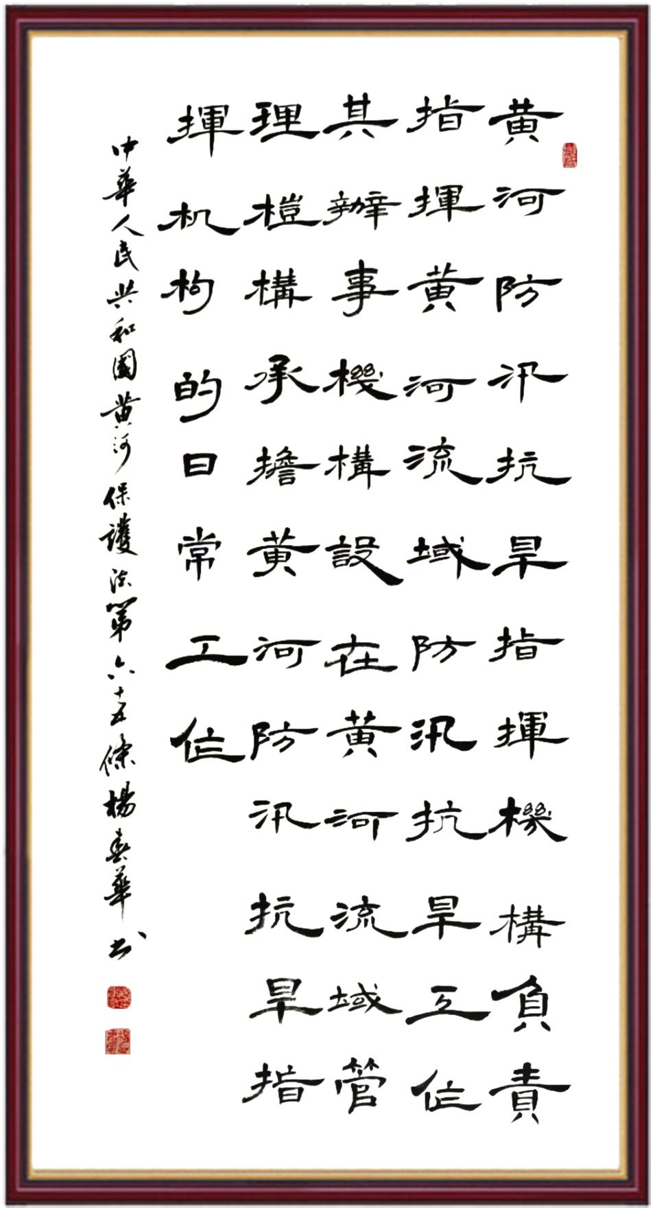 黃河寧,天下平。黃河是中華民族的發(fā)源地和搖籃,保護(hù)黃河是事關(guān)中華民族偉大復(fù)興的千秋大計(jì)。《中華人民共和國(guó)黃河保護(hù)法》為推進(jìn)水資源節(jié)約集約利用、保護(hù)傳承弘揚(yáng)黃河文化、推動(dòng)黃河流域生態(tài)保護(hù)和高質(zhì)量發(fā)展提供了有力法治保障。繼書(shū)寫(xiě)《中華人民共和國(guó)民法典》《中華人民共和國(guó)憲法》《中華人民共和國(guó)澳門(mén)特別行政區(qū)基本法》《中華人民共和國(guó)香港特別行政區(qū)基本法》《中華人民共和國(guó)國(guó)旗法》《中華人民共和國(guó)國(guó)徽法》《中華人民共和國(guó)國(guó)歌法》《中華人民共和國(guó)法官法》等法律法規(guī)之后,法制日?qǐng)?bào)社聯(lián)合沿黃九省(區(qū))司法廳、書(shū)法家協(xié)會(huì),將筆端對(duì)準(zhǔn)《中華人民共和國(guó)黃河保護(hù)法》。