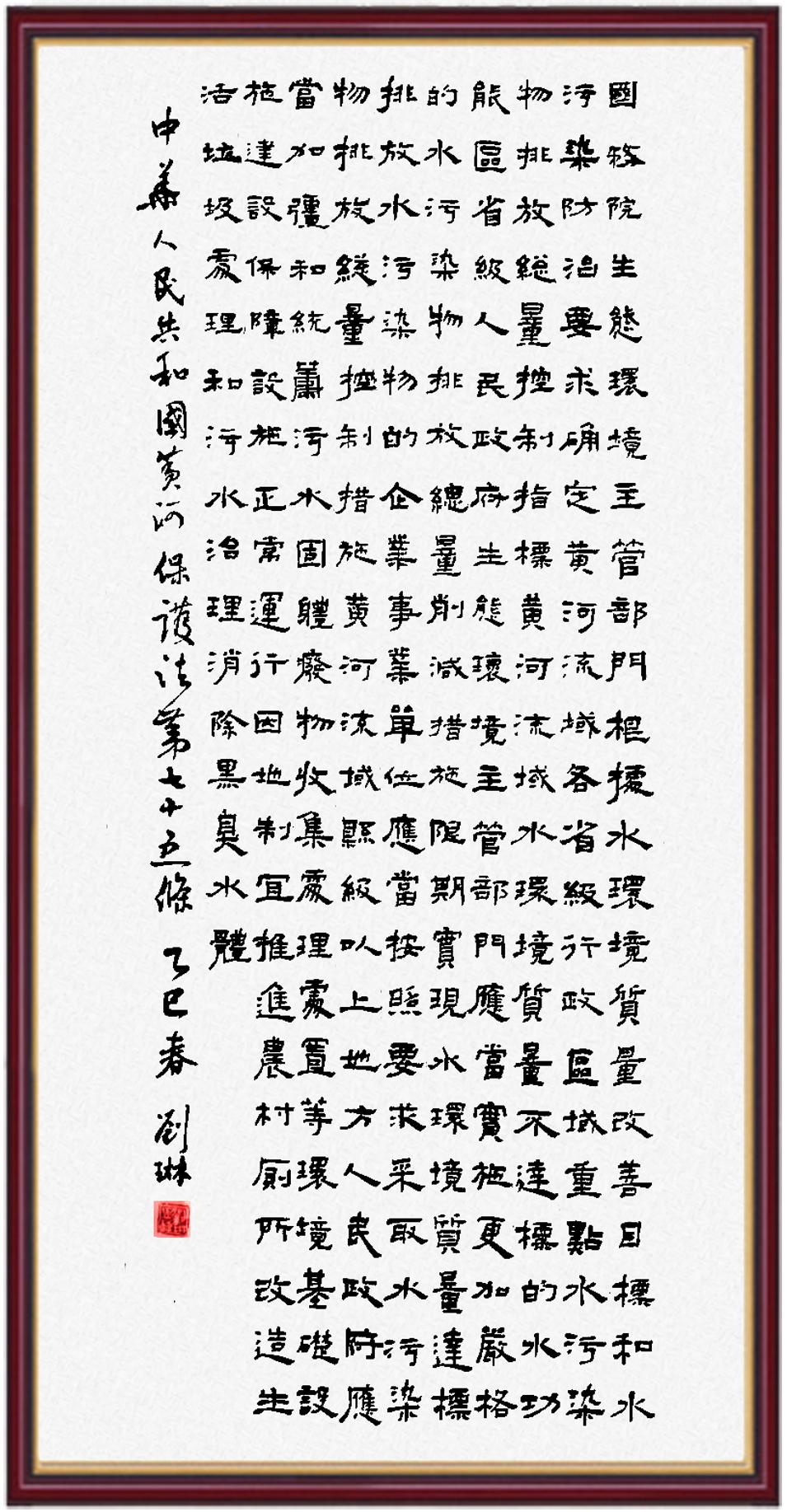 黃河寧,天下平。黃河是中華民族的發(fā)源地和搖籃,保護(hù)黃河是事關(guān)中華民族偉大復(fù)興的千秋大計(jì)?!吨腥A人民共和國(guó)黃河保護(hù)法》為推進(jìn)水資源節(jié)約集約利用、保護(hù)傳承弘揚(yáng)黃河文化、推動(dòng)黃河流域生態(tài)保護(hù)和高質(zhì)量發(fā)展提供了有力法治保障。繼書(shū)寫(xiě)《中華人民共和國(guó)民法典》《中華人民共和國(guó)憲法》《中華人民共和國(guó)澳門(mén)特別行政區(qū)基本法》《中華人民共和國(guó)香港特別行政區(qū)基本法》《中華人民共和國(guó)國(guó)旗法》《中華人民共和國(guó)國(guó)徽法》《中華人民共和國(guó)國(guó)歌法》《中華人民共和國(guó)法官法》等法律法規(guī)之后,法制日?qǐng)?bào)社聯(lián)合沿黃九省(區(qū))司法廳、書(shū)法家協(xié)會(huì),將筆端對(duì)準(zhǔn)《中華人民共和國(guó)黃河保護(hù)法》。