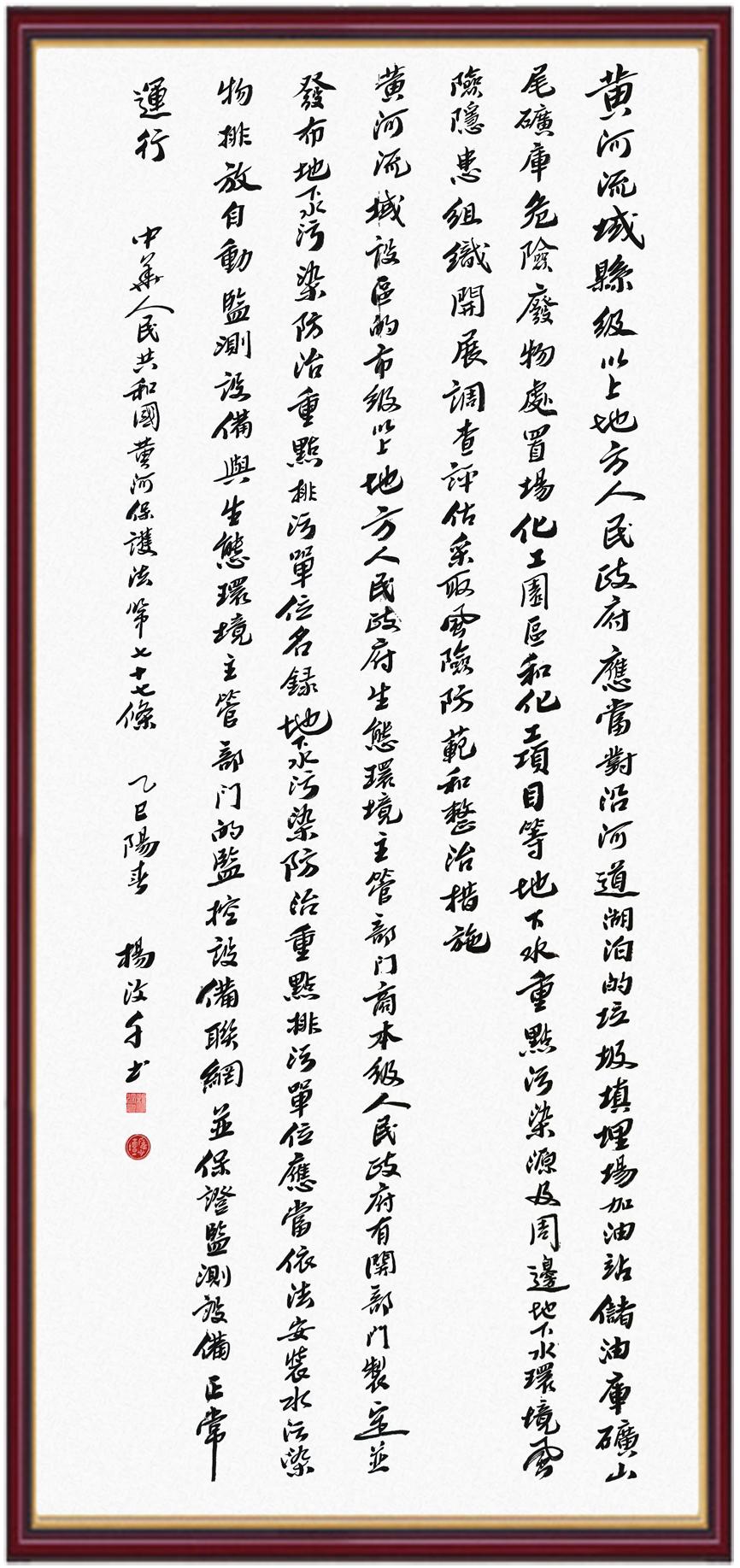 黃河寧,天下平。黃河是中華民族的發(fā)源地和搖籃,保護(hù)黃河是事關(guān)中華民族偉大復(fù)興的千秋大計(jì)?!吨腥A人民共和國(guó)黃河保護(hù)法》為推進(jìn)水資源節(jié)約集約利用、保護(hù)傳承弘揚(yáng)黃河文化、推動(dòng)黃河流域生態(tài)保護(hù)和高質(zhì)量發(fā)展提供了有力法治保障。繼書寫《中華人民共和國(guó)民法典》《中華人民共和國(guó)憲法》《中華人民共和國(guó)澳門特別行政區(qū)基本法》《中華人民共和國(guó)香港特別行政區(qū)基本法》《中華人民共和國(guó)國(guó)旗法》《中華人民共和國(guó)國(guó)徽法》《中華人民共和國(guó)國(guó)歌法》《中華人民共和國(guó)法官法》等法律法規(guī)之后,法制日?qǐng)?bào)社聯(lián)合沿黃九?。▍^(qū))司法廳、書法家協(xié)會(huì),將筆端對(duì)準(zhǔn)《中華人民共和國(guó)黃河保護(hù)法》。