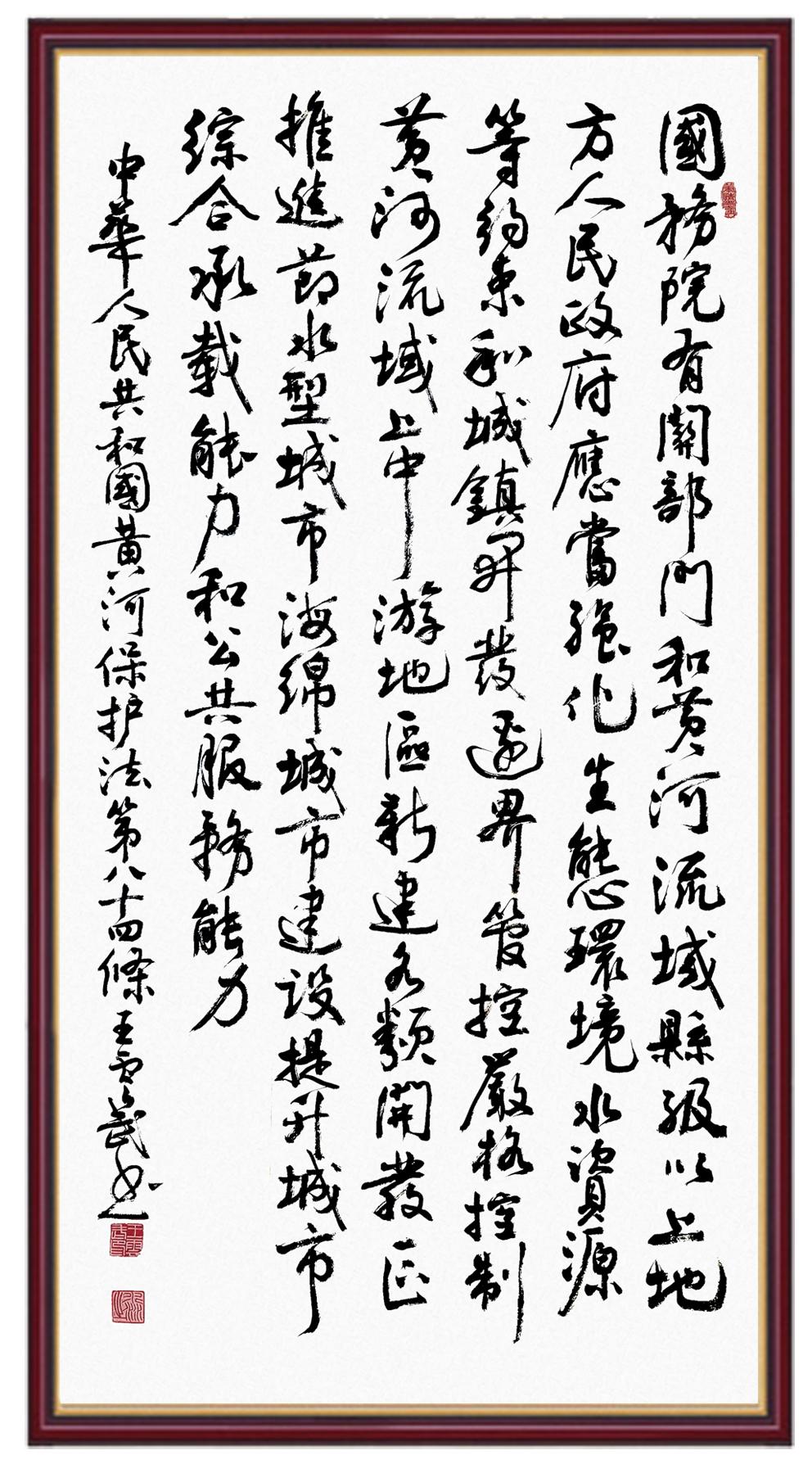 黃河寧,天下平。黃河是中華民族的發(fā)源地和搖籃,保護(hù)黃河是事關(guān)中華民族偉大復(fù)興的千秋大計(jì)。《中華人民共和國(guó)黃河保護(hù)法》為推進(jìn)水資源節(jié)約集約利用、保護(hù)傳承弘揚(yáng)黃河文化、推動(dòng)黃河流域生態(tài)保護(hù)和高質(zhì)量發(fā)展提供了有力法治保障。繼書寫《中華人民共和國(guó)民法典》《中華人民共和國(guó)憲法》《中華人民共和國(guó)澳門特別行政區(qū)基本法》《中華人民共和國(guó)香港特別行政區(qū)基本法》《中華人民共和國(guó)國(guó)旗法》《中華人民共和國(guó)國(guó)徽法》《中華人民共和國(guó)國(guó)歌法》《中華人民共和國(guó)法官法》等法律法規(guī)之后,法制日?qǐng)?bào)社聯(lián)合沿黃九?。▍^(qū))司法廳、書法家協(xié)會(huì),將筆端對(duì)準(zhǔn)《中華人民共和國(guó)黃河保護(hù)法》。