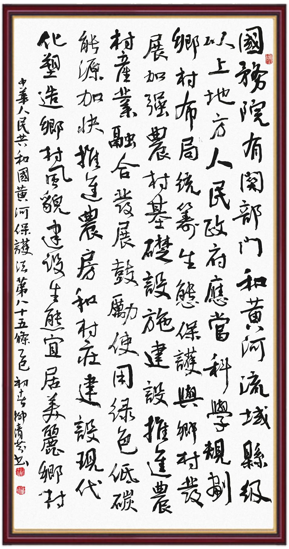 黃河寧,天下平。黃河是中華民族的發(fā)源地和搖籃,保護(hù)黃河是事關(guān)中華民族偉大復(fù)興的千秋大計。《中華人民共和國黃河保護(hù)法》為推進(jìn)水資源節(jié)約集約利用、保護(hù)傳承弘揚(yáng)黃河文化、推動黃河流域生態(tài)保護(hù)和高質(zhì)量發(fā)展提供了有力法治保障。繼書寫《中華人民共和國民法典》《中華人民共和國憲法》《中華人民共和國澳門特別行政區(qū)基本法》《中華人民共和國香港特別行政區(qū)基本法》《中華人民共和國國旗法》《中華人民共和國國徽法》《中華人民共和國國歌法》《中華人民共和國法官法》等法律法規(guī)之后,法制日報社聯(lián)合沿黃九?。▍^(qū))司法廳、書法家協(xié)會,將筆端對準(zhǔn)《中華人民共和國黃河保護(hù)法》。