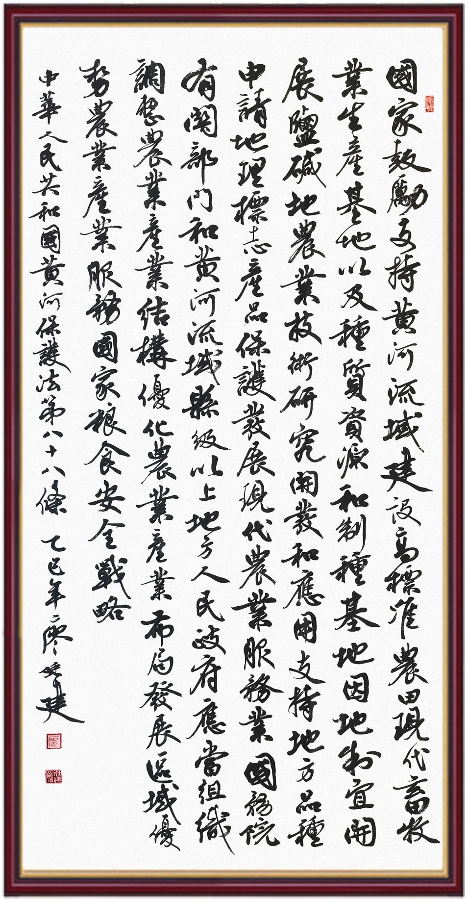 黃河寧,天下平。黃河是中華民族的發(fā)源地和搖籃,保護黃河是事關(guān)中華民族偉大復興的千秋大計?!吨腥A人民共和國黃河保護法》為推進水資源節(jié)約集約利用、保護傳承弘揚黃河文化、推動黃河流域生態(tài)保護和高質(zhì)量發(fā)展提供了有力法治保障。繼書寫《中華人民共和國民法典》《中華人民共和國憲法》《中華人民共和國澳門特別行政區(qū)基本法》《中華人民共和國香港特別行政區(qū)基本法》《中華人民共和國國旗法》《中華人民共和國國徽法》《中華人民共和國國歌法》《中華人民共和國法官法》等法律法規(guī)之后,法制日報社聯(lián)合沿黃九省(區(qū))司法廳、書法家協(xié)會,將筆端對準《中華人民共和國黃河保護法》。