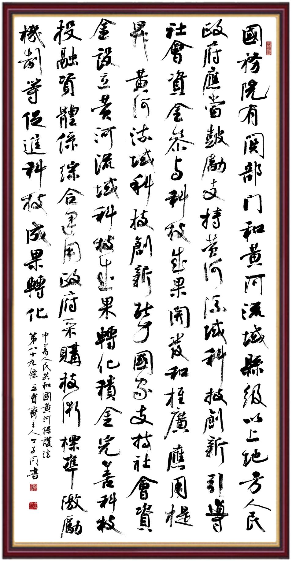 黃河寧,天下平。黃河是中華民族的發(fā)源地和搖籃,保護(hù)黃河是事關(guān)中華民族偉大復(fù)興的千秋大計(jì)?!吨腥A人民共和國(guó)黃河保護(hù)法》為推進(jìn)水資源節(jié)約集約利用、保護(hù)傳承弘揚(yáng)黃河文化、推動(dòng)黃河流域生態(tài)保護(hù)和高質(zhì)量發(fā)展提供了有力法治保障。繼書(shū)寫(xiě)《中華人民共和國(guó)民法典》《中華人民共和國(guó)憲法》《中華人民共和國(guó)澳門特別行政區(qū)基本法》《中華人民共和國(guó)香港特別行政區(qū)基本法》《中華人民共和國(guó)國(guó)旗法》《中華人民共和國(guó)國(guó)徽法》《中華人民共和國(guó)國(guó)歌法》《中華人民共和國(guó)法官法》等法律法規(guī)之后,法制日?qǐng)?bào)社聯(lián)合沿黃九?。▍^(qū))司法廳、書(shū)法家協(xié)會(huì),將筆端對(duì)準(zhǔn)《中華人民共和國(guó)黃河保護(hù)法》。